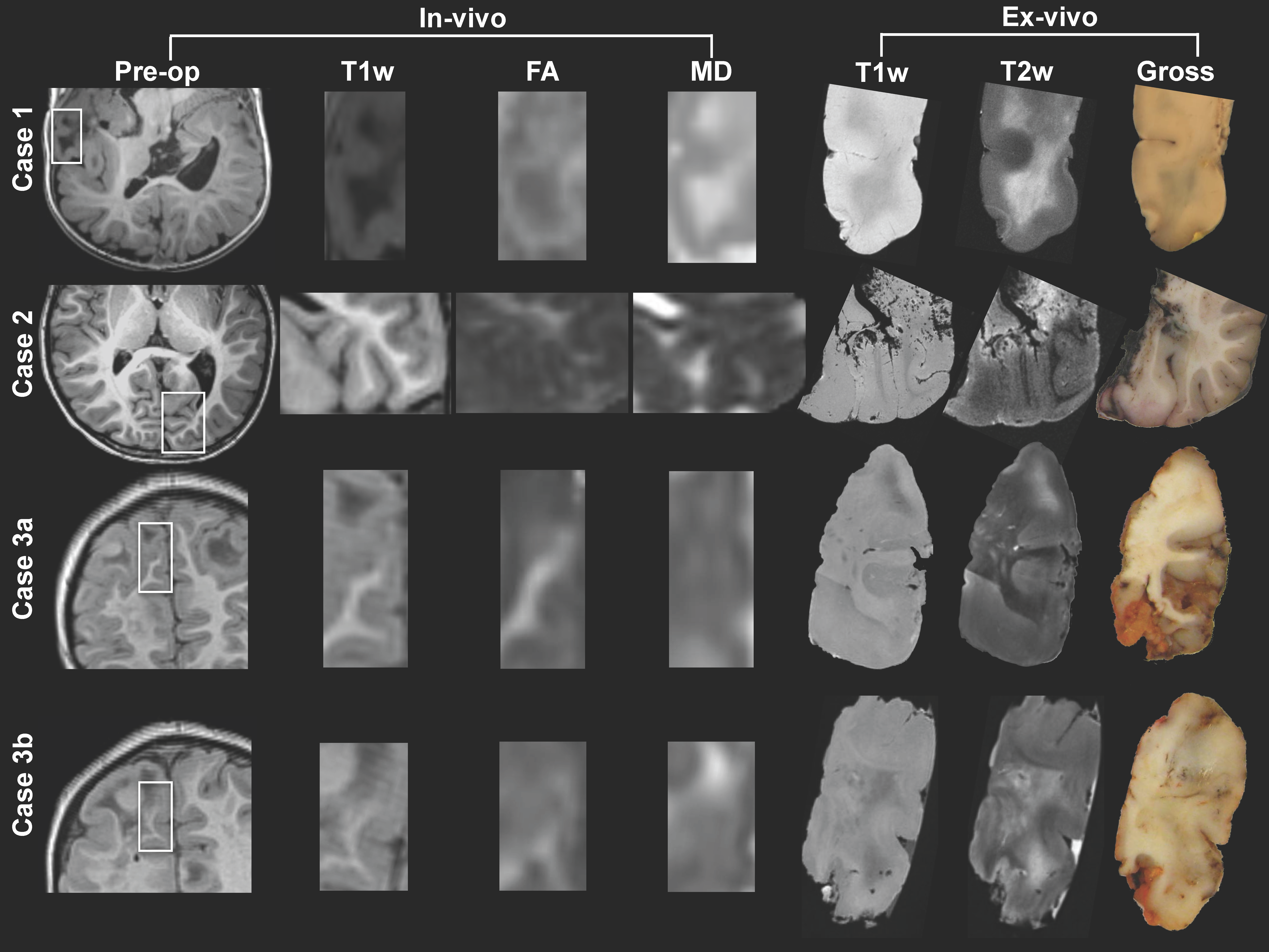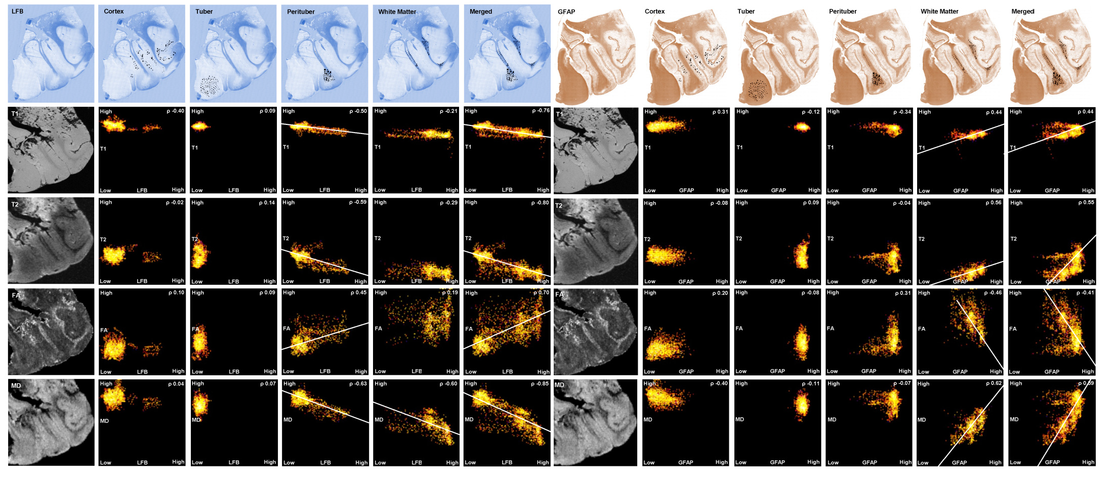 Rationale: To clarify the basis of abnormal diffusion in Tuberous Sclerosis Complex (TSC) in the proximity of epileptogenic tubers, we correlated ex vivo high-resolution diffusion imaging of white matter, perituber and tuber regions with histopathology. Methods: Three 'en-block' epilepsy surgical specimens from children with TSC were scanned in a 3T or 7T MRI with a structural image isotropic resolution of 137-300 micron, and diffusion image isotropic resolution of 270-1,000 micron. Next, we stained four specimens for myelin (luxol fast blue, LFB) and gliosis (glial fibrillary acidic protein, GFAP), and registered digitized slides (0.686 micron resolution) to high-resolution ex vivo MRI for histopathological comparison.Figure 1: Pre-operative imaging and orientation of resection specimens ex vivo.Resection regions are highlighted in the white rectangle in the preoperative images. Magnified frames of T1-weighted (T1w), fractional anisotropy (FA) and mean diffusivity (MD) are shown, and compared to the ex vivo images on the right. Note that the imaging plane is manipulated to match the ex vivo cutting plane and histopathology slides; e.g. case 1 is a pseudo-axial plane, and images may be inverted along any axis. Results: In white matter and perituber regions, LFB optical density (OD) correlated with fractional anisotropy (FA) and inversely with mean diffusivity (MD) and T2w intensity. In white matter but not perituber tissue, GFAP OD correlated with MD and T2w, and inversely with FA. In tubers and in the cortex, there was little variation in mean LFB and GFAP signal intensity, and no correlation with MRI metrics.Figure 2: Example: Quantitative comparison of histopathology and ex vivo MRI for case 2(LEFT ) Luxol fast blue (LFB) stain, after color deconvolution. (RIGHT ) Glial fibrillary acidic protein (GFAP) stain, after color deconvolution.In the left column, ex vivo structural images (T1w, T2w) and diffusion imaging (fractional anisotropy FA, mean diffusivity MD). On the top row, the regions of interest (ROIs) are placed in specific ultrastructural tissue types: Cortex, tuber, perituber, and white matter. In the last column, two tissue types (perituber and white matter) are merged, yielding a wider variability. The colored dots indicate intensity histograms, and the hot colors indicate more overlap between MRI metrics and histopathology optical density values. Spearman’s Rho correlations are listed, and regression lines are shown for higher values. Conclusions: These findings suggest diffusion imaging abnormalities in microscopic tissue types correspond to specific histopathological markers in TSC. Funding: J. Peters, B. Scherrer, S. Prabhu, M. Sahin, and S. Warfield are supported by NIH R01 NS079788 and U01 NS082320 grants. A. Prohl is supported by Harvard Catalyst | The Harvard Clinical and Translational Science Center (National Center for Research Resources and the National Center for Advancing Translational Sciences, NIH award UL1 TR001102). S. Prabhu is also supported by the Department of Defense W81XWH-11-1-0365. M. Sahin is additionally supported by NIH U54 HD090255 and U54 HD090255 grants and the Boston Children’s Hospital Translational Research Program. The Developmental Synaptopathies Consortium (U54 NS092090) is part of the NCATS Rare Diseases Clinical Research Network (RDCRN). RDCRN is an initiative of the Office of Rare Diseases Research (ORDR), NCATS, funded through collaboration between NCATS, NIMH, NINDS, and NICHD. We thank the Harvard Medical School Neurobiology Department and the Neurobiology Imaging Facility for consultation and instrument availability that supported this work. This facility is supported in part by the Neural Imaging Center as part of an NINDS P30 Core Center grant #NS072030.