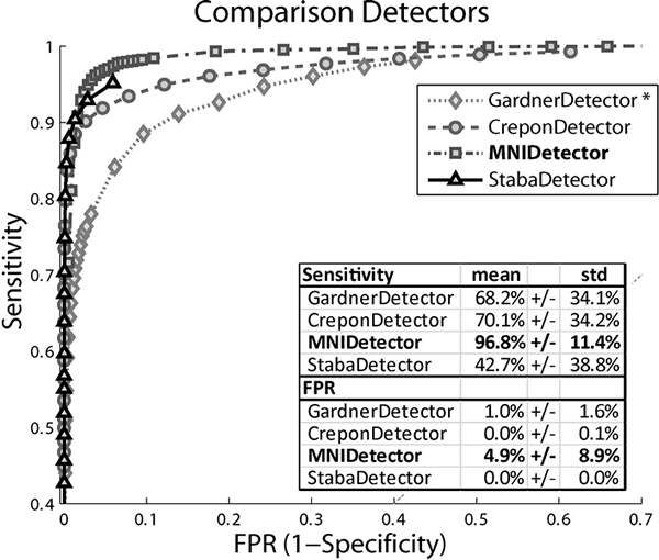 Rationale: High Frequency Oscillations (HFOs) are emerging as a biomarker of epileptogenic tissue. Visual marking of HFOs can be performed, but it is highly time consuming and subjectivity is inevitable. Thus, the development of automatic HFO detectors is crucial for the systematic study of HFOs and for their eventual utilization in clinical settings. At present, only a handful automatic detectors exist. In this study, a systematic comparison of the detectors on the same data set is presented. Methods: Intracerebral EEGs from 20 randomly selected patients were processed (filtered at 500Hz and sampled at 2000Hz). HFO events were identified independently by two experienced reviewers in all functioning channels during one minute of slow wave sleep. In addition, baseline segments (where it was clear that no oscillation was present) were visually marked. Channels with nearly continuous high frequency activity were excluded, resulting in 278 channels. These channels included 5238 visually identified HFO events (positive events) and 51076 visually identified baselines (negative events) that were used as the gold standard events. Four automatic HFO detectors were compared. Three are based on the comparison of the energy of the signal with the EEG epoch that includes the events. The main difference among them is the type of energy function computed on the filtered signal, either the root mean square amplitude (Staba et al., J Neurophysiol 2002; 88: 1743-52), the short-time line length (Gardner et al., Clin Neurophysiol 2007; 118: 1134-43), or the Hilbert envelope (Cr pon et al., Brain 2010; 133: 33-45). The fourth detector, the MNI detector (Zelmann et al., IEEE EMBS 2010, submitted), first detects baseline segments, where no oscillatory activity is present, and then compares the energy (root mean square amplitude) of the EEG signal with that of the detected baselines. In this way, the local characteristics of the background are considered. Receiver Operator Curves (ROC) were computed for each channel and averaged. The threshold values were computed according to the specifications of each detector. Results: The MNI detector had significantly higher sensitivity than the others, but at a cost of significantly higher false positive rate (FPR). Figure 1 presents the average ROC and performance table. The overall low FPR is not surprising, since we are only considering as reference negative events those segments of EEG visually marked as baselines. Thus, not all the EEG signal was considered in this study. The main difference in performance is observed in very active channels. Figure 2 shows an example of such channels, where one HFO is detected by all detectors whereas another is detected only by the MNI detector. Conclusions: Each automatic detector was developed for different EEG recordings and with different aims. Given the lack of a formal definition of HFOs, comparing them in a single data set is important to analyse their performance. The MNI detector performed better than the others in this dataset, but has larger FPR and was developed on channels similar to those used for testing. Supported by NSERC PGSD, CIHR MOP-10189.