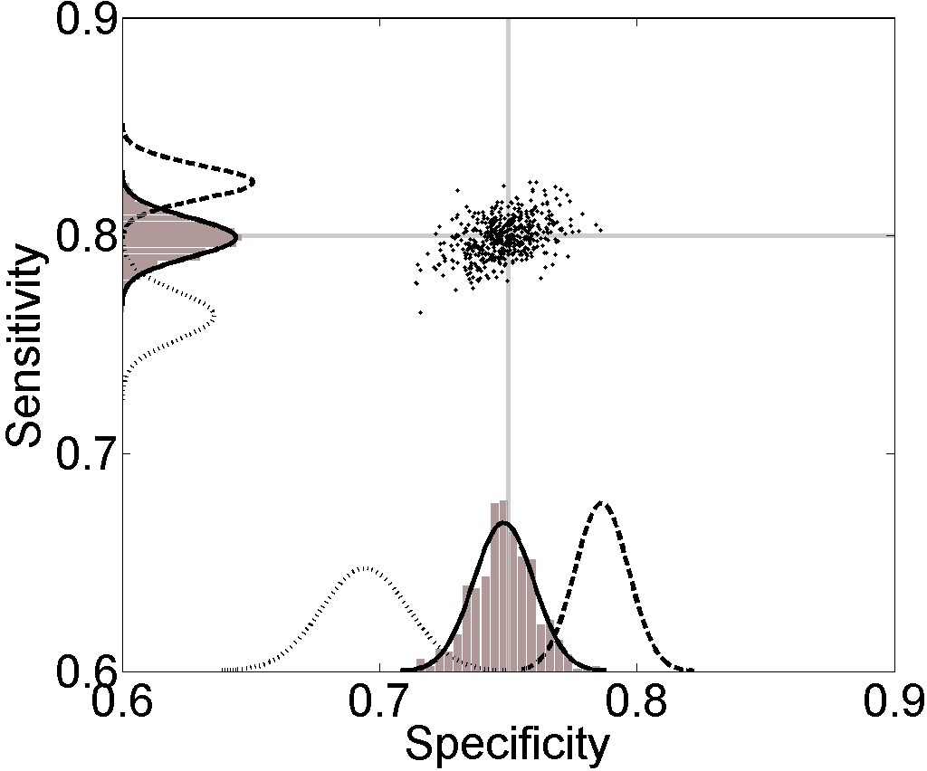 Rationale: For EEG there is no "gold standard" interpretation, and thus the diagnostic accuracy of an interpreter can only be estimated. We describe a new method to estimate diagnostic accuracy that requires no reference standard and is based on efficiently extracting the sensitivity (s) and specificity (p) of the interpreter from multiple re-readings of a set of EEGs. It also takes into account possible correlations among misclassification errors. Methods: Each of N EEG recordings was interpreted twice (≥ 2 interpretations are allowed) and classified as normal (NL) or abnormal (AbNL). The interpretation pairs form a contingency table. To quantify the correlation of misclassification errors between interpretations we defined Cohen's kappas that represent the conditional covariance of the pairs of interpretations for all AbNL (κA) and NL (κN) studies. The prevalence of abnormality (Δ) was estimated directly from the proportion of AbNL interpretations. s and p were computed from the contingency table as a function of assumed values for κA and κN. The method was tested in a simulation and with a large dataset of real EEG interpretations. Results: The simulation used the following realistic parameters: Δ=60%, s=0.8, p=0.75; κA=κN= 0.1. Using these values, 3000 studies and two interpretations per study were randomly generated, and the accuracy estimated from the results. The simulation was repeated 500 times. The 95% CI for the estimated values of s and p were 1.3% and 6.3% of the true values (Figure). Modeling of misclassification correlations suggested that for most cases kappa values remain ≤ 0.1 and have a small effect on the estimated accuracy. In the Figure each point represents an estimated accuracy, and the true accuracy is at the intersection of the horizontal and vertical gray lines. The distribution of estimated values is indicated along each axis. The black curve is the distribution when the true values of kappa are used in the estimation. Dashed and dotted curves show the distributions corresponding to estimated accuracies when κA=κN= 0 and and κA=κN= 0.2 are used, respectively. The method was also applied to a pre-existing set of 227 EEGs recorded from ED patients with AMS. The official clinical interpretation was labeled EEG0. The EEGs were de-identified, technologist annotations removed, and re-interpreted by two of six randomly selected epileptologists (labeled EEG1A,B). For this study all interpretations were recoded as Nl or AbNL. By using EEG0 as the reference standard (Δ=79%), s and p of EEG1 were directly measured as s=0.87 and p=0.48. We then used our method to recalculate accuracy parameters from the contingency table of EEG1 interpretations by assuming various values for κA and κN. The accuracy of EEG1 was s=0.94 and p=0.77 (kappa= 0), and s=0.92 and p=0.67 (kappa= 0.2). Conclusions: These results from both simulated and actual EEG interpretations indicate that provided a realistic estimate of Δ, the method is able to estimate the true interpretation accuracy without recourse to a "gold" standard, and is capable of taking into account the correlation between misclassification errors.