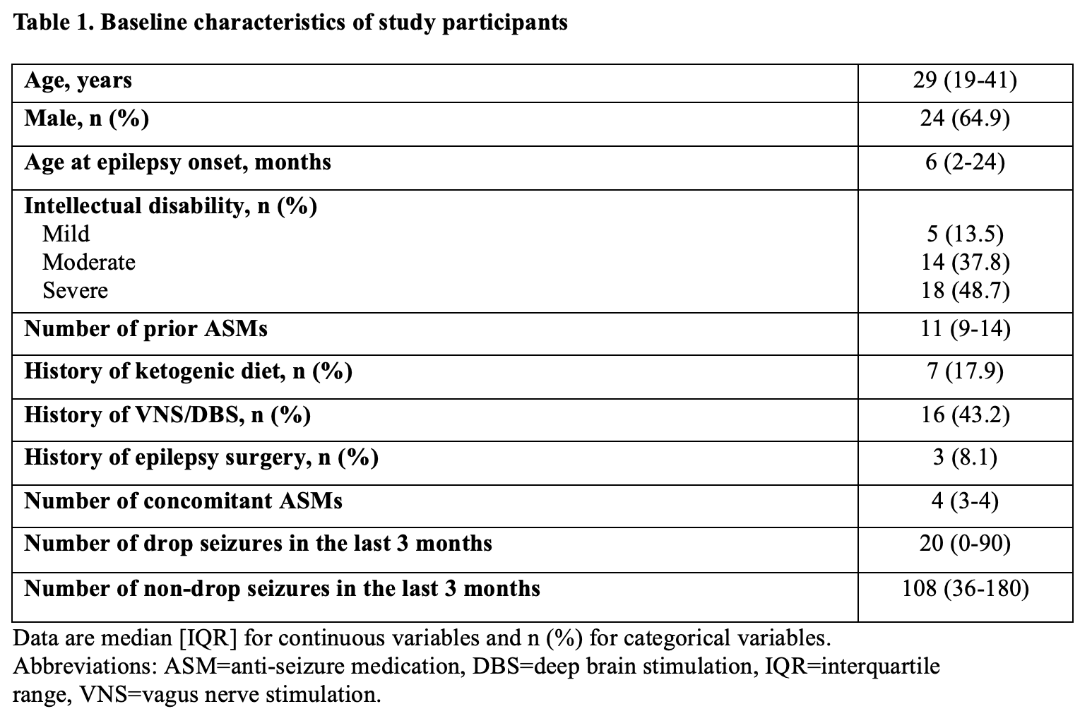 There was a reduction in the mean number of prolonged seizures that required the use of rescue medications in the last 3 months from 1.2 before starting FFA to 0.6 at 6-month follow-up. Discontinuation of one concomitant antiseizure medication (ASM) occurred in 7/37 (18.9%) and discontinuation of two concomitant ASMs in 1/37 (2.7%) participants.