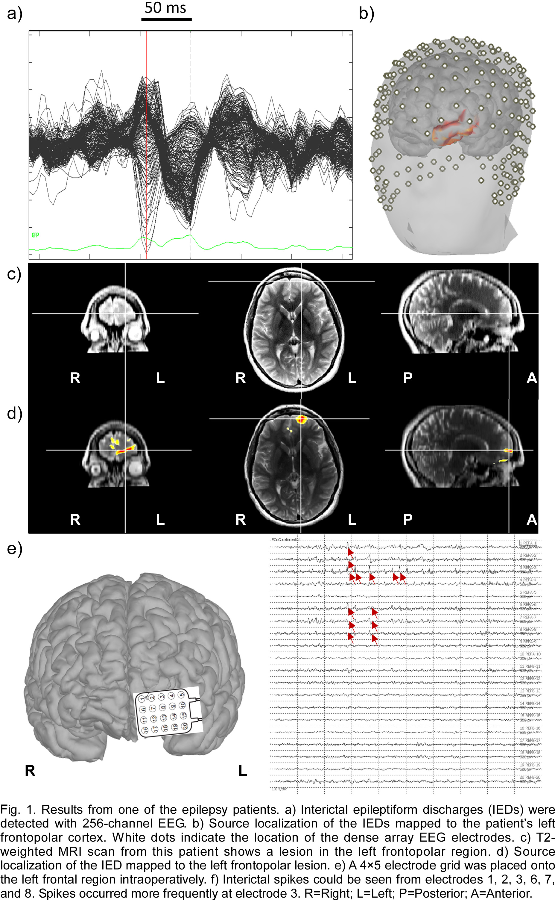 Rationale: Dense-array EEG using 256 channels could potentially localize epileptogenic foci and map brain functions in epilepsy patients more precisely. However, it is impossible to mark the interictal epileptiform discharges (IEDs) by visual inspection from all 256 channels. Hence, neurologists have to translate the 256-channel data to the more traditional 10-20 montage to review the EEG offline, which defeats the purpose of using a high-density EEG system. Additionally, EMG artifact can be recorded very easily by the dense-array EEG, obscuring IEDs when using currently available IED detection algorithms. In this study, we introduce a new algorithm that can automatically detect IEDs in 256-channel data in the presence of EMG artifact. Methods: In a pilot study, dense-array EEGs were recorded from three epilepsy patients with eyes closed via the EGI Geodesic EEG 400 system at a sampling rate of 1000 Hz for 30 minutes. EEG data were exported and pre-processed with Matlab programs developed in-house. The EEG was down-sampled to 250 Hz and filtered between 1 Hz and 70 Hz. The global field power (GFP) and entropy across all 256 channels were computed at each time point. GFP is sensitive to polarity changes across channels, while entropy can be employed to eliminate the contaminating effects of EMG artifact. IEDs were identified by auto-thresholding both GFP and entropy. Source localization of the IEDs was determined using an sLORETA inverse solution in Brainstorm (a Matlab-based program) and mapped onto each patient's individual MRI. Intracranial EEG and/or intraoperative ECoG recordings were utilized to evaluate the accuracy of the IED source localizations. Results: IEDs were successfully detected from patients' 30-min EEG recordings, all of which have been inspected and verified by neurologists. Some IEDs in close proximity to the previous resection from one patient with recurrent temporal lobe epilepsy were not obvious when recorded with a traditional 10-20 montage. For patients with significant lesions shown on MRI, the IED locations were determined to be on top of the lesions. These IED source localization results are in agreement with findings from intracranial EEG and/or intraoperative ECoG recordings. Conclusions: Our automated detection algorithm introduced in this study is very precise at identifying IEDs from 256-channel EEG recordings. It is highly effective at capturing IEDs that might not be obvious using a traditional 10-20 montage. EMG artifacts could be easily identified and had no effect on IED detections. Funding: N/A