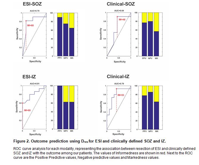 Rationale: Pediatric epilepsies caused by focal cortical dysplasia (FCD) can be singled out among medically refractory epilepsies (MREs) as an exceptionally severe type of epilepsy. In this study, we investigated the potential clinical utility of electric source imaging (ESI) on intracranial EEG (iEEG) as a new approach for surgical planning in patients with focal MRE undergoing intracranial long-term monitoring (LTM). The goal of the study is to perform ESI of ictal and interictal epileptiform discharges using iEEG and assess its predictive value in terms of surgical outcome in children with MRE and FCD. To this purpose, we also estimated the predictive value of the clinically-defined seizure onset zone (clinical-SOZ) and irritative zone (clinical-IZ) and compared it with the ESI-SOZ and ESI-IZ. Methods: We retrospectively analyzed long term monitoring iEEG data from 25 children with MRE confirmed to have FCD after resection. For each patient, ictal events recorded during the LTM period were analyzed as well as a 10-12 min segment of interictal data, recorded with subdural and/or depth electrodes. Ictal rhythmic activity at seizure onset and interictal spikes were marked by two reviewers who were blinded to each other's results (Fig. 1). We determined the location of each iEEG contact on the patient's cortex by co-registering presurgical MRI with post-implantation CT. For each patient, we defined the ESI-SOZ and ESI-IZ by localizing all the ictal and interictal events using the Equivalent Current Dipole (ECD) method. We also defined the clinical-SOZ as all the iEEG contacts active at seizure onset and the clinical-IZ as the most interictally active iEEG contacts. The resected volume were determined by co-registering the patient’s presurgical and postsurgical MRIs. For ESI, we calculated the distance of each SOZ or IZ dipole from the closest resection border (Dres). Finally, for each patient, we estimated the percentage of resection (proportion of dipoles with Dres <15 mm) of both ESI-SOZ and ESI-IZ and tested its predictive value in terms of surgical outcome, dichotomized into good (Engel 1) and poor. The optimal threshold on the percentage of resection to predict outcome was assessed using the receiver operating characteristic curve (ROC). Similarly, we assessed the predictive value of the clinical-SOZ and IZ. Results: We localized interictal spikes in all 25 patients (average: 11 spikes/min). Ictal data from 157 seizures of 18 patients were also included (average of 9 seizures/patient). ROC analysis showed that the resection of the ESI-IZ was more predictive of good outcome (Engel 1) than clinical-IZ (Fig. 2): (i) for ESI-IZ, we estimated a positive predictive value (PPV) of 100%, negative predictive value (NPV) of 63%, and informedness (IM) of 60% (Fisher’s test: p=0.003); (ii) for clinical-IZ, we had a PPV of 78%, NPV of 86%, and IM of 53% (Fisher’s test: p=0.007). Similarly, for the SOZ, the resection of the ESI solution was more predictive than the clinical-SOZ: (i) for ESI-SOZ, we estimated a PPV of 90%, NPV of 75%, and IM of 68% (Fisher’s test: p=0.013); (ii) For clinical-SOZ, we had a PPV of 77%, NPV of 80%, and IM of 48% (Fisher’s test: p=0.047). Conclusions: Our study showed that the ESI definition of both IZ and SOZ using iEEG has the potential to guide the surgical resection in children with MRE and FCD. Our findings indicate that the resection of the IZ and SOZ defined by ESI potentially increases the likelihood of postsurgical good outcome compared to the resection of clinically-defined IZ and SOZ. Funding: No funding