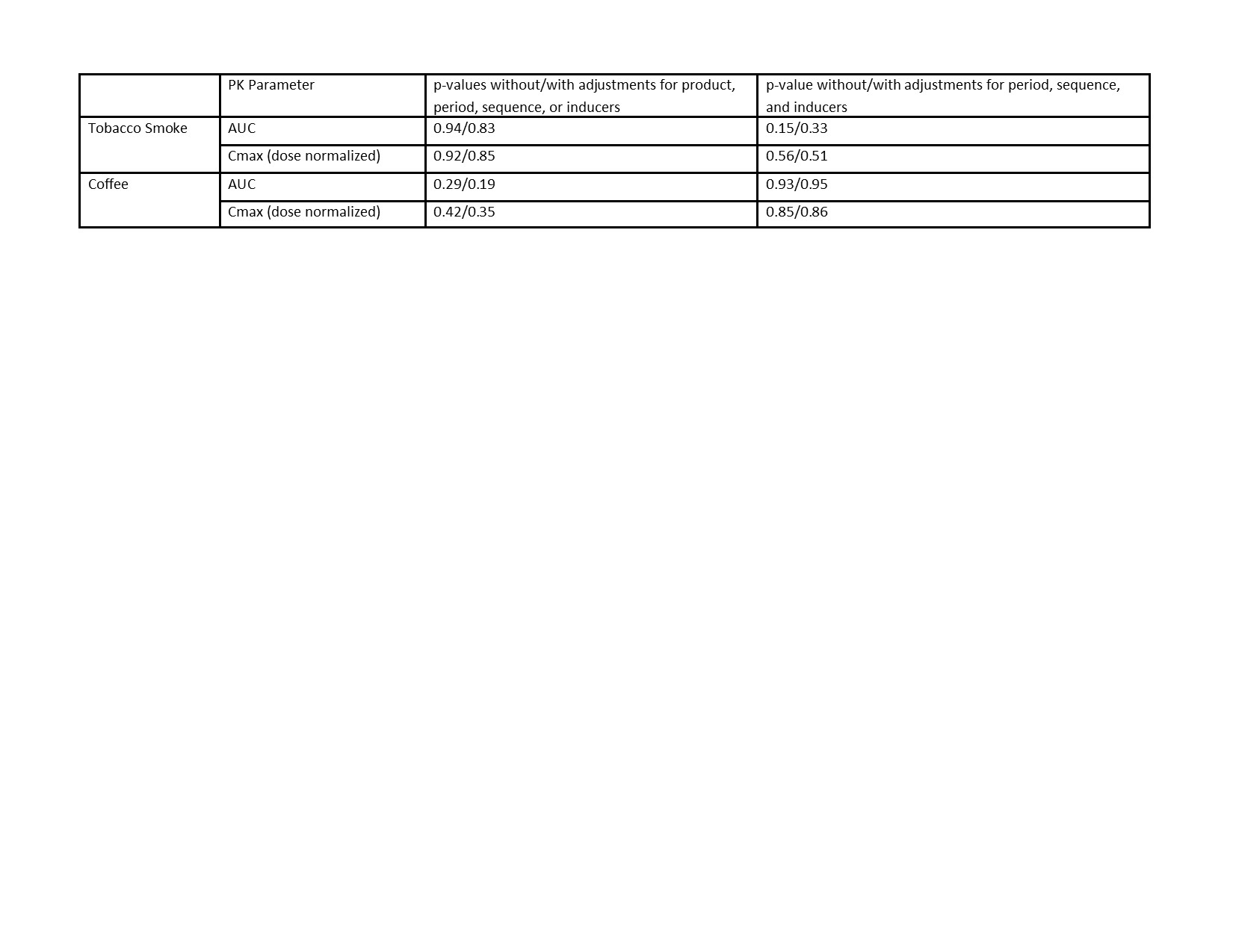 Rationale: Lamotrigine (LTG ) is primarily metabolized by glucuronyl transferases (UGT). The major metabolite, N2-glucuronidated-LTG is inactive and the primary metabolite found in the urine. The conversion of LTG to the N2-glucuronide conjugate is via UGT1A4, although UGT1A1, 1A3, 1A6, 1A7, and UGT2B7 contribute to forming this metabolite to a lesser extent. LTG is also reportedly a substrate for several efflux transport proteins, including P-glycoprotein (PgP) and breast cancer resistance protein (BCRP). The effects of concomitant UGT inducers such as carbamazepine, phenytoin and phenobarbital on LTG PK are well known, the impact of non-drug substances such as tobacco and coffee are less clear. Literature suggests various phenolic phytochemicals contained in coffee can induce UGT expression, as well as BCRP. Cigarette smoking may also increase UGT expression in rodents, and in one report, to reduce LTG serum concentrations in patients. As a result of these reports, we qualitatively documented use of coffee and tobacco in the Equigen chronic dose study. The Equigen chronic dose study was a study of generic LTG substitution using a 4-period replicate design with 19 LTG concentrations measured over 12-hours in each subject for each period. This analysis was designed to determine if interactions were detected in this group of patients. Methods: As part of the statistical analysis of factors influencing LTG pharmacokinetics (PK) in the Equigen chronic dose study, we collected qualitative data from enrolled patients on their use of coffee and tobacco. Subjects were instructed to not change their typical consumption of these products for the duration of the study. Statistical analysis of these factors was done prospectively. Results: A total of 35 subjects dose were included in the analysis. No significant difference was seen in PK parameters with any of the products. Conclusions: Coffee and tobacco use did not alter PK parameters of lamotrigine. Funding: US Food and Drug Administration (contract HHSF223201110112A) Epilepsy Foundation American Epilepsy Society
