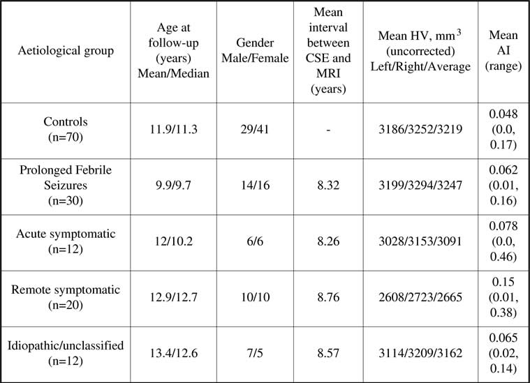 Rationale: There is a long-standing hypothesis that prolonged febrile seizures (PFS), the most common form of childhood CSE, cause mesial temporal sclerosis (MTS). CSE may result in acute hippocampal changes but whether this leads to long-term damage or MTS is uncertain. Radiological features of MTS may not be evident until several years post-CSE, but hippocampal volume reduction and/or asymmetry could be identified earlier. From an ongoing follow-up study investigating outcomes of a unique prospectively ascertained paediatric population-based cohort, we report quantitative hippocampal volumetry results a mean of 8.5 years post-CSE. Methods: Brain MRI was performed on a Siemens 1.5T scanner and T1-weighted images acquired using a three-dimensional fast low angle shot (3D FLASH) sequence providing 1mm3 isometric voxels. Hippocampal volumetry was performed using FSL software v4.1.9. Images were reformatted in a tilted coronal plane perpendicular to the long axis of the hippocampus and each hippocampal slice was manually measured independently by 2 investigators blind to clinical details. The hippocampal volume (HV) was measured on each side and right-left asymmetry calculated using asymmetry index (AI= (HV Right- HV Left) / 0.5x (HV Right+ HV Left). Coefficient of variation (CoV) was calculated to determine inter- and intra-rater agreement for HV measurements. Intracranial volume (ICV) was calculated using Brain Extraction Tool (BET) in FSL. HV and AIs were compared across aetiological groups using univariate ANOVA and post-hoc tests with Bonferroni correction in SPSS v21. Results: Hippocampal volumetry was performed on 144 children (70 healthy controls, 30 PFS, 12 acute symptomatic, 20 remote symptomatic and 12 idiopathic/unclassified CSE). The mean interval between CSE and MRI was 8.5 (range 6.3-10) years. Demographic and volumetry data are presented in table 1. CoV was 5.79 for inter- and 5.13 for intra-rater agreement. HV was significantly correlated with ICV (p=0.008) and age (p=0.015). There was no significant difference in mean corrected HV across the aetiological groups except the remote symptomatic group. Mean HV for remote symptomatic group was 553mm3 (95%CI 259-848, p=0.021) lower than controls. The AI for the remote symptomatic group was significantly higher compared with all the other groups (p<0.05 for all). There was no significant difference in the corrected mean HV or AI between PFS, acute symptomatic, idiopathic/unclassified CSE and controls. Three children with PFS who subsequently developed epilepsy had HV and AI in the normal range. One child with a history of CSE with meningitis had AI of 0.46, and neuroimaging features of unilateral MTS, but no epilepsy. Conclusions: On group analysis, hippocampal growth in children who had PFS, acute symptomatic and idiopathic/unclassified CSE is not impaired at a mean follow-up of 8.5 years post-CSE. Children with remote symptomatic CSE have a significant reduction in hippocampal volume and increased asymmetry compared to all the other groups.