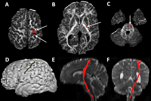 Rationale: The purpose of this study was to determine the cortical origin of corticospinal tract (CST) and its location in the posterior limb of internal capsule (PLIC) using DTI tractography and to compare the CST origin with cortical stimulation data. Methods: This study included 32 children with intractable focal epilepsy (age: 2.2-17.6 yrs; 17 girls), who underwent DTI and functional motor mapping for the primary motor hand area using cortical stimulation. 23 healthy children (age: 2.5-12.4 yrs; 11 girls) also underwent DTI. The CST was delineated by DTI tractography, without presuming precentral gyrus to be the motor cortex: Regions of interest were placed at the anterior portion of the brainstem and at the corona radiata, and the cortical origin as well as its location in the PLIC was determined. In epileptic children, the cortical origin of CST in the affected hemisphere was compared to the location of primary motor hand areas determined by cortical stimulation. Subsequently, the origin of CST and its location in the PLIC in the affected hemisphere of the epileptic children was compared with those in the contralateral hemisphere as well as in controls. Results: In the affected hemisphere of epileptic children, DTI showed that the CST originated from the precentral gyrus in 3 children, from the postcentral gyrus in 4, and from both pre & postcentral gyri in 24 children. Cortical stimulation identified the primary motor hand area in the precentral gyrus in 1 epileptic child, in the postcentral gyrus in 5, and in both pre & postcentral gyri in 23 children. The proportion of overall agreement between cortical stimulation and DTI tractography in localization of motor cortex was 0.86, and positive agreement between these two modalities was found to be 0.92. The pattern of cortical origin of CST was similar between the affected and contralateral hemispheres of epileptic children as well as between epileptic children and controls (Table). In both affected and contralateral hemispheres of the epileptic children and in controls, the CST was located at around two-thirds of the way across from the anterior margin of the PLIC, and occupied about 25% of its dimension. Conclusions: We conclude that the CST frequently originates from both pre and postcentral gyri and is located at the posterior aspect of the PLIC. Furthermore, there is good concordance between DTI tractography and direct cortical stimulation in localization of the primary motor cortex; thus, DTI can be useful in non-invasive localization of CST.