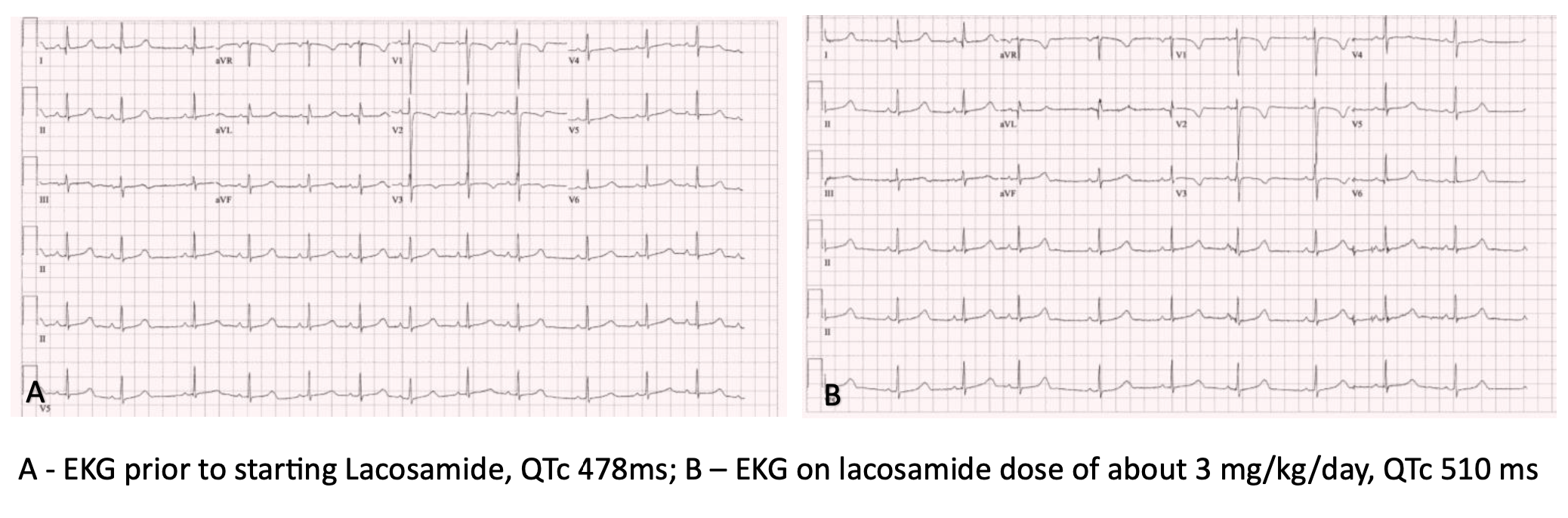 Results: A six-year-old girl with LQT14 due to a de novo pathogenic CALM1 mutation (c.389A >G) presented with new-onset focal seizures. EEG demonstrated frequent right occipital spikes, and brain MRI was unremarkable. An implantable loop recorder showed no arrhythmias at the times of her seizures. Levetiracetam significantly worsened QTc. Oxcarbazepine had no effect on QTc but was stopped due to rash. Lacosamide was initiated at 3 mg/kg/day with seizure control for over 20 months. Dose was increased when seizures recurred to about 6 mg/kg/day. Serial ECGs showed only minimal increase in QTc with lacosamide.