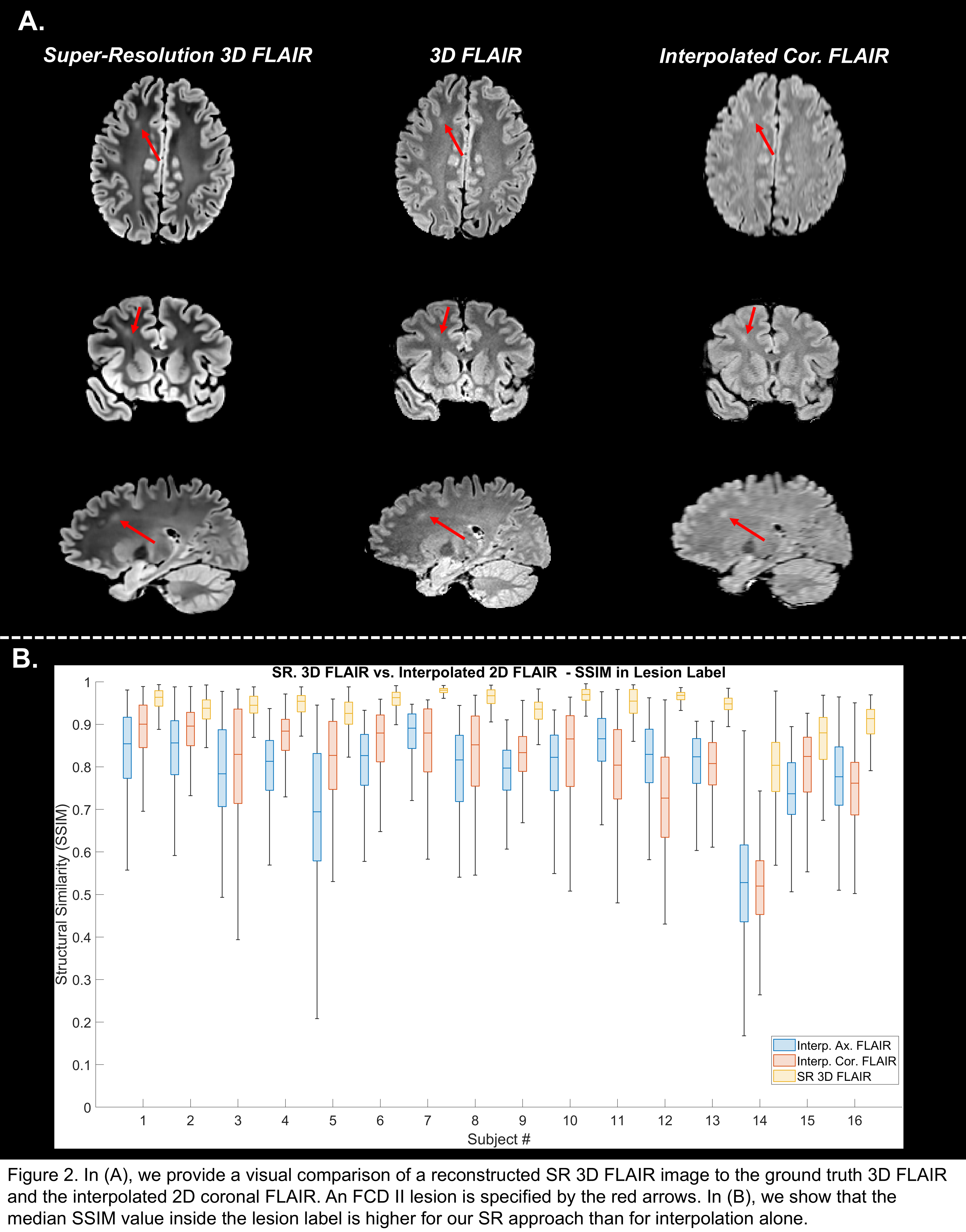 Results: The median SSIM for the SR 3D FLAIR images was 0.96, significantly higher than that for the interpolated 2D coronal (0.81, p < 0.001) and 2D axial (0.77, p < 0.001) FLAIR. In lesional patients, the median SSIM for lesional voxels was 0.93 for the SR 3D FLAIR, again significantly greater than that for the interpolated 2D coronal (0.81, p < 0.001) and 2D axial (0.79, p < 0.001) FLAIR (Figure 2B). Subtle features of FCD II lesions were preserved (Figure 2A).