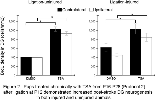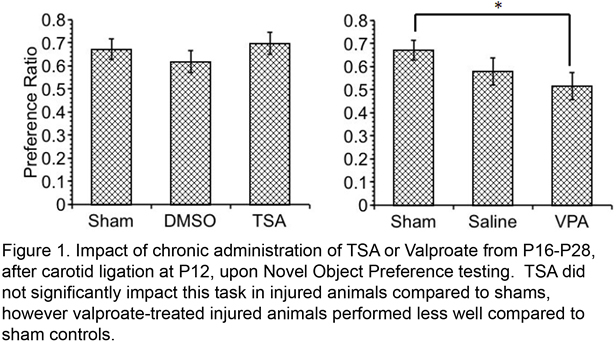 Rationale: Post-stroke neurogenesis in the SGZ of the immature brain is decreased and may contribute to the long-term cognitive impairments seen. Histone deacetylase inhibition has been shown in adult models to have neuroprotective, pro-neurogenic and anti-epileptic effects. We aimed to determine if chronic histone deacetylase inhibition after stroke in the immature brain impacts post-stroke neurogenesis, injury or behavioral outcome. Methods: Two drug administration protocols were used. In the first (Protocol 1), unilateral carotid ligation of P12 CD1 mice was followed by trichostatin A (TSA, 2.5 mg/kg i.p.) or DMSO injections, or valproic acid (200 mg/kg i.p.) or saline injections, twice a day for 2 weeks from P16-P28, BrdU was administered from P20-P22, behavioral testing between P38-42, and animals perfused at P60. Sham surgery treated animals also received BrdU and behavioral testing but no drug or vehicle injections. In the second (Protocol 2), TSA (2.5 mg/kg) or vehicle was given from P16-P28, BrdU administered from P24-P26, and perfusions at P42. Injury was assessed and immunohistochemistry was performed. Density of BrdU-labeling (cells/mm DG) in the dentate gyrus was measured.Results: Data from protocol 1 did not indicate any significant overall change in injury or DG neurogenesis in either injured (n=12-15 animals/group) or uninjured (n=4-6 animals/group) animals. However, a sex-dependent upregulation in neurogenesis was detected in the contralateral DG of injured male mice only (contralateral DG: DMSO 509.8 30.80 (n=5) and TSA 741.57 74.9 (n=4) and ipsilateral DG: DMSO 572.1 86.7 and TSA 600 93.2; p=0.046 and 0.8 respectively). All groups habituated on open field testing. Comparison of valproate-treated to sham-treated animals indicated that valproate-treated animals performed less well on the T-maze and on novel object preference testing (p=0.085 T-maze, p=0.045 Novel Object Preference; see Figure 1); TSA did not impact either of these tasks. Protocol 2 resulted in significant increases in DG neurogenesis in animals treated with TSA both in injured (mean ipsilateral TSA (n=10) =845.38 91.9 versus DMSO (n=4) = 448.6 30.5, p= 0.002; mean contralateral: TSA= 1031.9 115 versus DMSO= 620 84.5, p= 0.014) and uninjured animals (mean ipsilateral TSA (n=5)= 931.8 42.4 versus DMSO (n=5) = 397.5 35.2, p=0.000; mean contralateral TSA= 1028.7 51.4 versus DMSO= 406.3 42, p=0.000; see Figure 2). No sex differences were noted in Protocol 2.Conclusions: The impact of TSA in this model is likely to depend on the age and sex of the animal, duration of TSA treatment before BrdU labeling, and/or time after BrdU labeling at which survival of newborn BrdU labeled cells are counted. Further work is being done to determine the extent of histone deacetylation and to determine the long-term impact of TSA-enhanced neurogenesis upon long-term functional outcomes. Furthermore, chronic administration of valproate may have important negative functional consequences upon the immature brain that may be related to its other mechanisms of action.