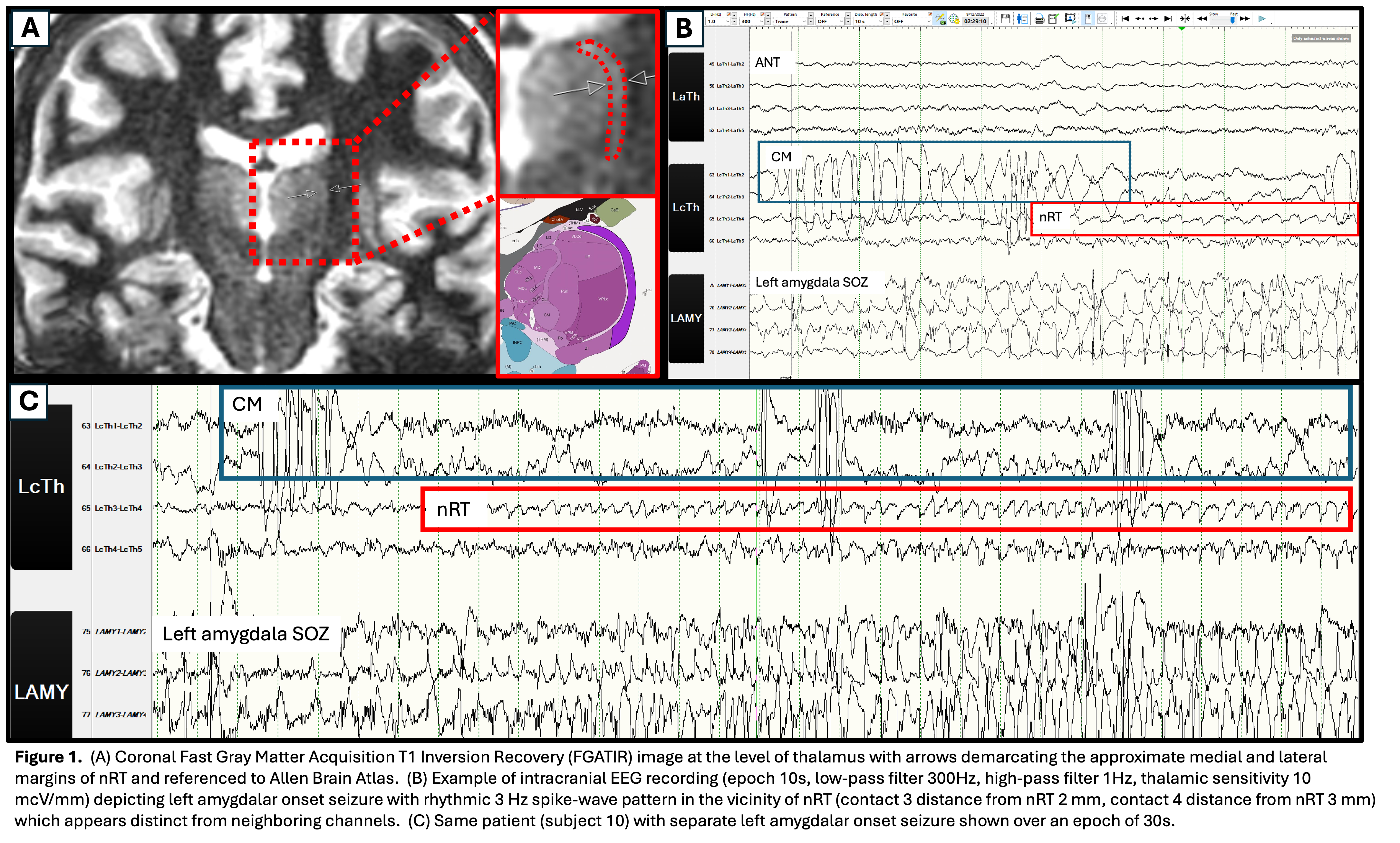 This retrospective study was approved by the Stanford Institutional Review Board (IRB). An epileptologist reviewed intracranial EEG recordings from 10 medically refractory epilepsy patients who had implanted depth electrodes (5 mm contact spacing) targeting the anterior (ANT) or the centromedian (CM) nucleus of the thalamus, with trajectory traversing near nRT. Neuroradiologists determined which electrode contact was closest to nRT using thin-cut postoperative brain CT co-registered with 3 Tesla MRI. Despite having a shell-like structure, nRT was visualized using FGATIR and/or FSPGR sequences and the distance to nearest electrode contact was measured.