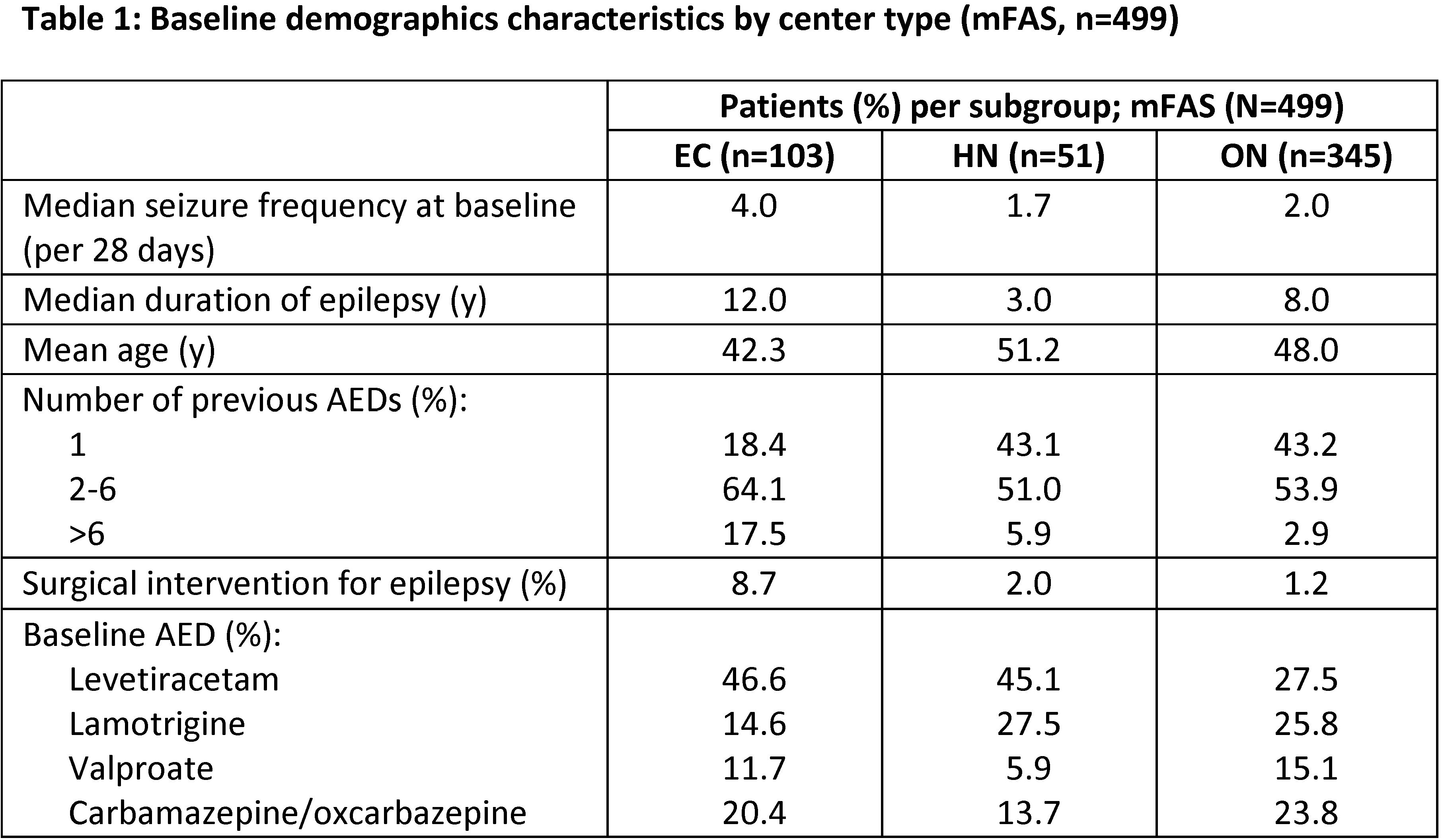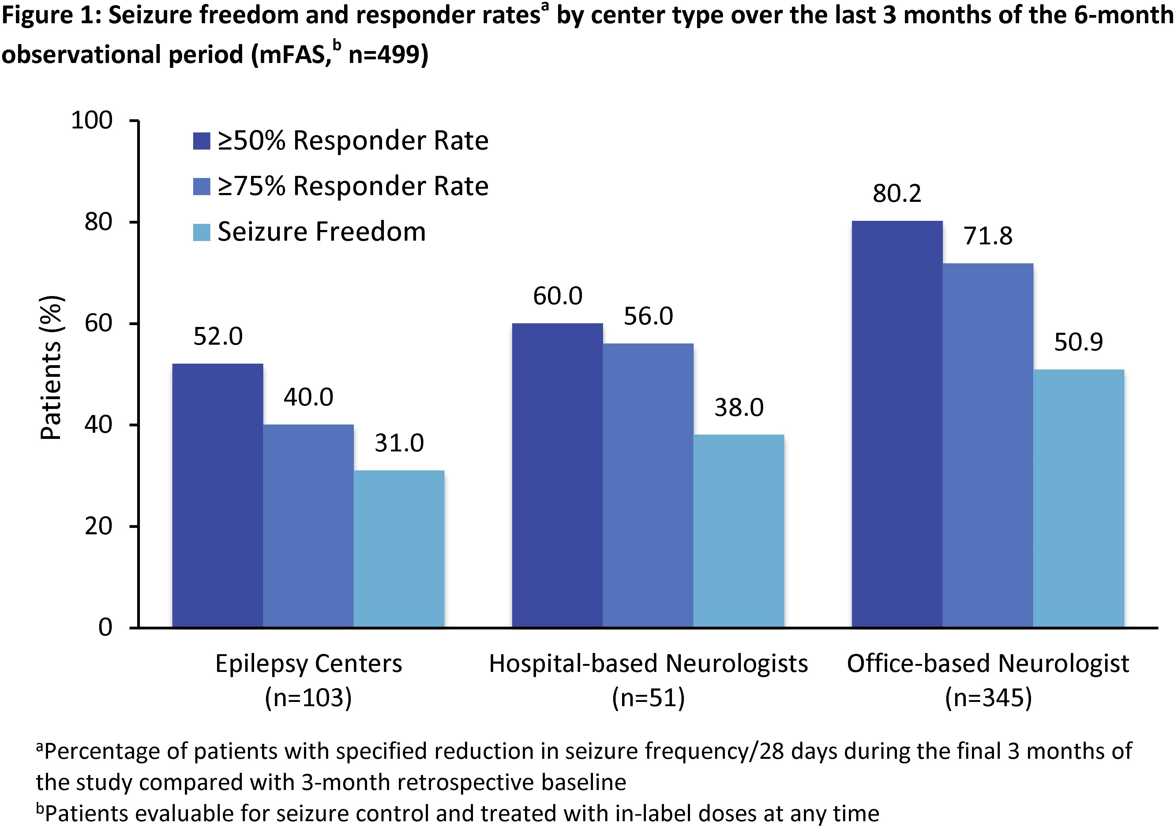 Rationale: In pivotal studies of adjunctive lacosamide (LCM) in adults, treatment-resistant patients on 1-3 concomitant antiepileptic drugs (AEDs) were enrolled. This non-interventional study (NCT01098162) evaluated seizure control and tolerability of adjunctive LCM in patients with POS receiving one concomitant baseline AED. To reflect actual medical care of epilepsy patients, study sites were chosen across the spectrum of office-based neurologists (ON), hospital-based neurologists (HN) and specialized epilepsy centers (EC). This pre-specified analysis was conducted to document patient baseline characteristics and treatment patterns in the physician's clinical practice, and the impact on seizure control and safety of LCM. Methods: This 6-month observational study was conducted in Germany. To mirror the actual medical care of epilepsy in Germany, ON, HN, and specialized EC were targeted at a ratio of 6(ON):1(HN) and 4(ON):1(EC). Outcome variables included changes in seizure frequency (≥50% and ≥75% responder and seizure freedom rates) at last study visit (6 months) compared with a 3-month retrospective baseline, as well as adverse events (AEs). All analyses are descriptive. Results: 112 centers and investigators participated, categorized as ON (86), HN (14) and EC (12), nearly mirroring the planned distribution. Of 573 patients enrolled, 571 were evaluable for safety, 520 for seizure control (FAS), and 499 were treated with in-label doses at any time (mFAS). ON, HN, EC enrolled 393/573 (68.6%) patients, 56/573 (9.8%) patients and 124/573 (21.6%) respectively. Marked differences in demographics were observed (Table 1) between EC and ON for number of previous AEDs, epilepsy duration, and mean seizure frequency at baseline, indicating a more refractory population treated by EC. Baseline treatment patterns also showed marked differences, with the largest difference observed for levetiracetam as the most frequently taken baseline AED for HN and EC in more than 45% of patients, compared with 27.5% for ON. Efficacy results (mFAS) are shown in Figure 1. During the final 3 months of the study, 31.0%, 38.0% and 50.9% of patients treated by EC, HN and ON, respectively, were seizure free. In total, AEs were reported in 48.5% of patients, 28.7% of whom experienced AEs considered related to LCM by the physician. EC and HN reported more related AEs than ON, in 47.5%, 58.9% and 26.7% of patients, respectively. For all three center types, dizziness and fatigue were the most frequently observed AEs. 81.3% of the patients completed the study; 18.9%, 8.9% and 8.4% treated by EC, HN and ON, respectively, discontinued due to an AE. Conclusions: LCM improved seizure control in routine clinical practice when added to one baseline AED, irrespective of the physician's specialization. Differences in efficacy may be explained by differences in baseline demographics between patients in different center types. Treatment with LCM was generally well tolerated. Funded by UCB Pharma