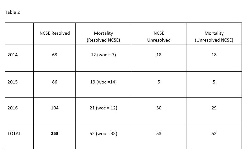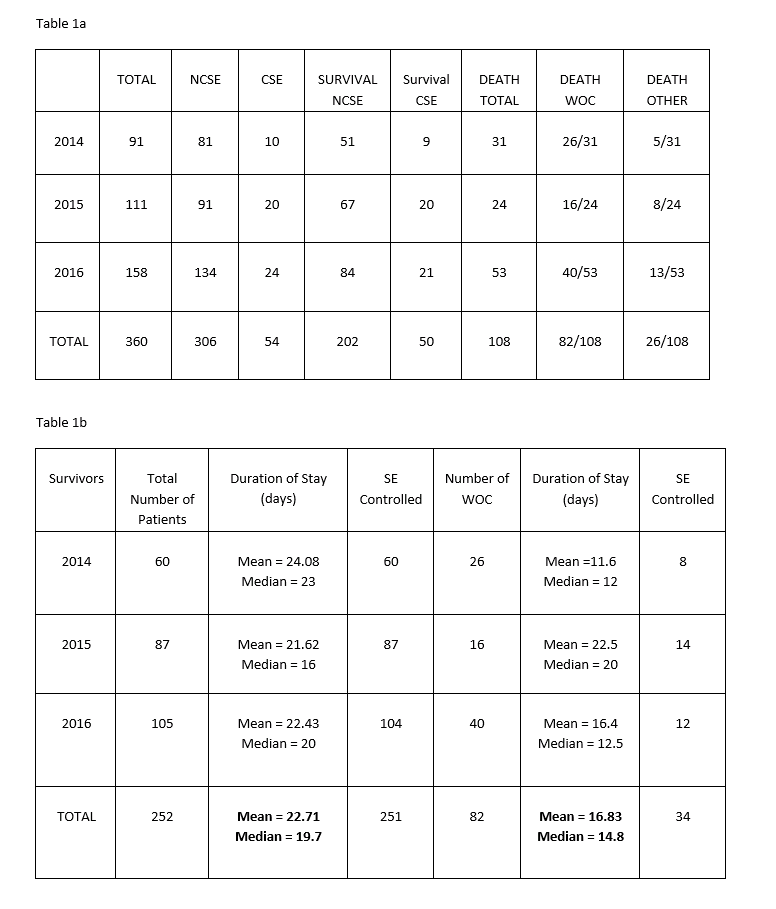 Rationale: Management of status epilepticus (SE) in a level IV epilepsy center to assess outcomes with the use of newer IV anti-seizure agents (AEDs) Methods: Retrospective chart review of 360 patients with status epilepticus (SE) at Ochsner Neuro ICU during 2014-2016 was done with IRB approval. Diagnosis and resolution of SE was based on electroencephalography (EEG) reviewed by US board certified epileptologists. Results: Demographics were 148 males and 212 females; age range of 19 - 97 years306/360 (85%) had non-convulsive status epilepticus (NCSE) and 54/360 (15%) patients convulsive status epilepticus (CSE). In-hospital stay was 2 - 123 days (mean 21.2 days; median 16.8 days). Overall outcome was 252/360 (70%) survivors and 108 (30%) deaths. (Tables 1 a and 1b)Breakdown of 237 survivors (Tables 1a and 1b)Patients with withdrawal of care (WOC) (Tables 1a and 1b)NCSE resolved in 253/306 (82.7 %) and CSE resolved in all 53/54 (98.2%)Mortality in resolved NCSE was 52/253 (20.5%) with 33/52 (63 %) from withdrawal of care (WOC) and 19/52 (37 %) due to medical complications (Table 2)Mortality was 52/53 (98.1%) in unresolved NCSE, with 47/52 (90.4%) from WOC and 5/52 (9.6%) from medical complications (Table 2)IV AEDs used were Levetiracetam (310/360, 86.1 %), Lacosamide (209/360, 80.1 %) and Phenytoin (18/360, 5%). Other AEDs included Clobazam (106/360, 29.4 %), Valproate (60/360, 16.7 %), Vigabatrin (44/360; 12.2%) and Perampanel 26/360 (7%)Propofol and ketamine were used as single agents in 122/306 (39.9%, range 5-150 mkm) and 10/306 (3.3 %, range 5-200 mkm) respectively in NCSE. Both agents were used together in 81/306 (26.5%) in NCSE. Propofol was used as single agent in 17/54 (31.5%). Ketamine was not used singly for any patient with CSE. Both agents were used together for 4/54 (7.6%) Conclusions: In our cohort, overall survival was 70% (252/360) survivors and 30% (108/360) deaths with resolution of SE in 85% (306/360): NCSE in 83% (253/306) and CSE in 98.1% (53/54)Survival was associated with mean NICU stay of 22.7 (median 19.7) days in comparison to patients with WOC of mean 16.8 (median 14.8) days. SE was controlled in 41.5% (34/82) of patients who had WOC. Withdrawal of care was the most common cause of mortality unrelated to resolution of SE. Funding: None