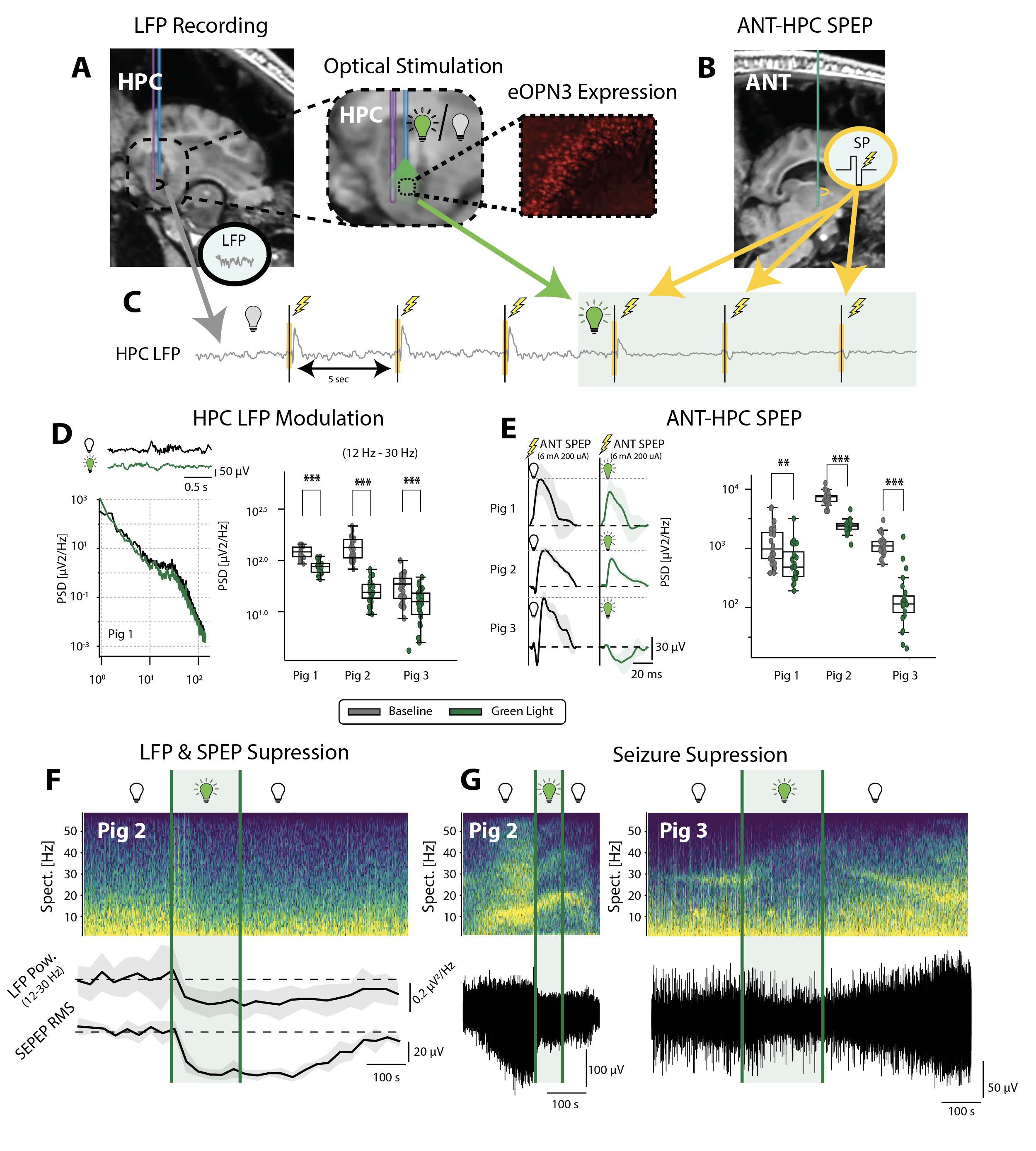 Methods: An optogenetic construct (AAV5/9-CaMKII-eOPN3-mScarlet; AAV titer: 2x1012 > particles/µl) with MRI contrast (Gadolinium) was stereotactically delivered into the bilateral hippocampus (HPC) and anterior nucleus of the thalamus (ANT) in 3 Göttingen micropigs. Post-surgical MRI imaging confirmed targeting accuracy. An acute experiment was performed two to three months later with four electrodes and optrodes placed in the ANT and HPC. The local field potentials (LFPs) were recorded at baseline and during stimulation for Single Pulse Electrical Potentials (SPEP) characterization of the ANT-HPC network. Stereotactically infused Kainic Acid (KA) was utilized to induce acute focal seizures in the HPC to study the inhibitory effect of eOPN3 on seizures. Fiber photometry and histopathology was performed to confirm eOPN3 expression during and after the acute study.