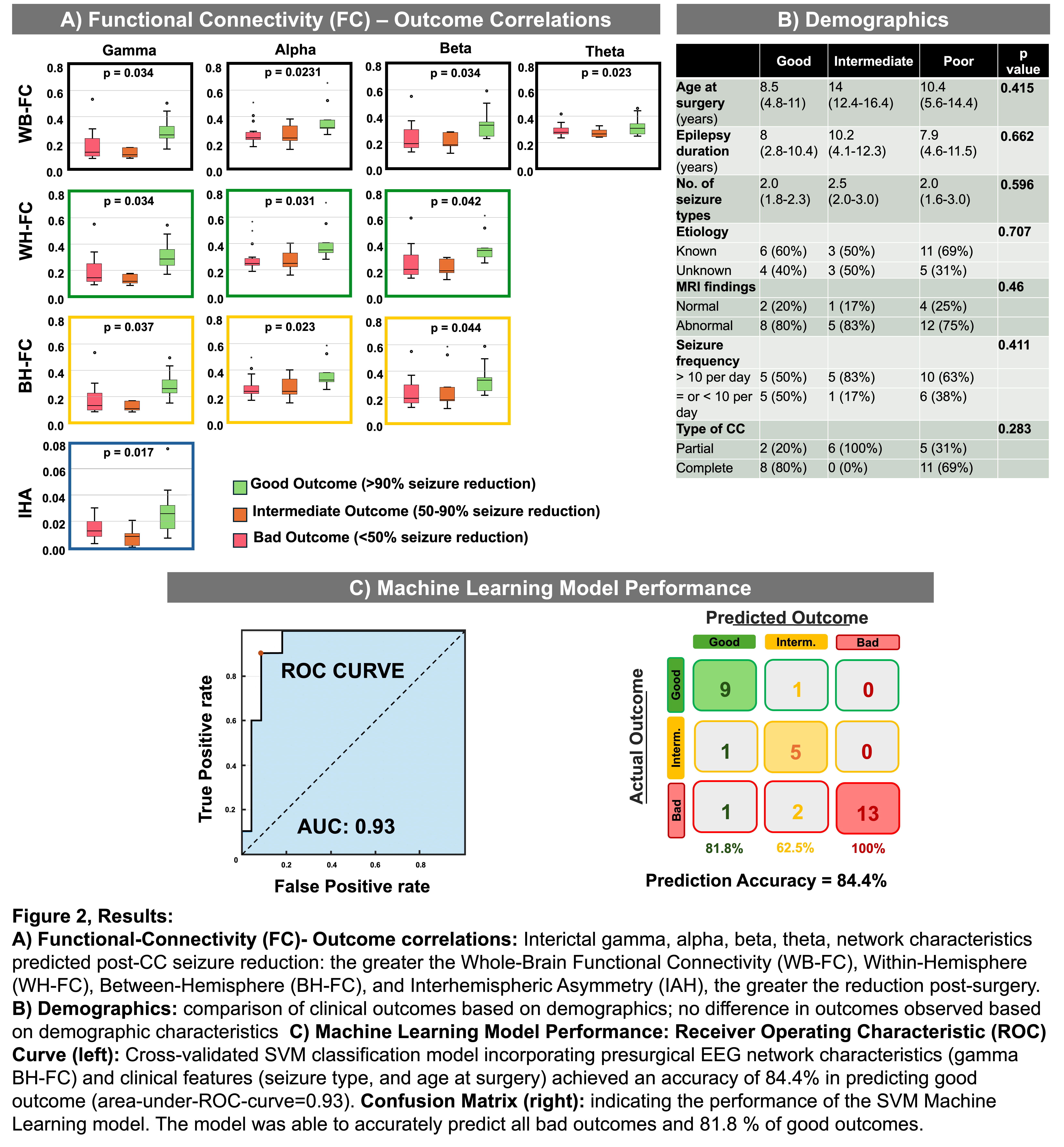 We analyzed 5 minutes of interictal scalp EEG data from 32 children with DRE who underwent CC (median age: 10.5 years, median time from EEG to surgery: 4.8 months). We estimated the brain FC in five frequency bands (delta, theta, beta, alpha, gamma), (Fig. 1A) and computed the following FC metrics: whole brain FC (WB-FC), within-hemisphere FC (WH-FC), between-hemisphere FC (BH-FC), and interhemispheric asymmetry (IHA), (Fig. 1B). We classified each patient into three outcome categories based on their seizure reduction (Excellent: >90%, Intermediate: 50-90%, Poor: < 50%) (Fig 1C). We then examined the correlation of each presurgical FC metric with the patients’ seizure outcome category (logistic regression). The effect of clinical characteristics on the outcome was also similarly tested. We also compared pre- and post-surgical FC (Wilcoxon signed-rank test) separately in optimal (excellent) and suboptimal (intermediate and poor) outcome groups. Finally, we developed a multi-feature classification model (support-vector-machine, SVM) to predict outcome (leave-one-out cross-validation).