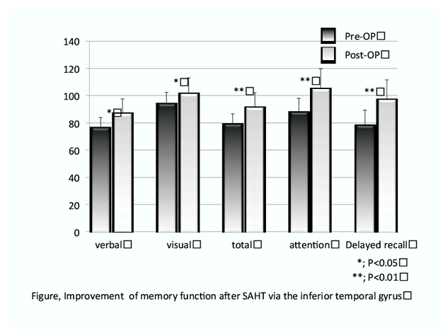 Rationale: We have already reported that selective amygdalohippocampectomy (SAHT) via the inferior temporal gyrus using neuronavigation system provides in excellent epilepsy control in patients with refractory mesial temporal lobe epilepsy (MTLE). This surgical procedure is less invasive and safer. Here, we analyzed the outcome of memory function after this surgical procedure. Methods: Nighteen patients with mesial temporal lobe epilepsy have undergone the SAHT procedure for MTLE via the inferior temporal gyrus. Among them, 12 patients utilized the Wechsler Memory Scale-Revised (WMS-R) score to evaluate memory function both just before and 6 to 12 months after SAHT. The lesions were located on verbal dominant hemispheres in 5 cases and on verbal non-dominant hemispheres in 7 cases. Results: The postoperative outcomes of 18 of all 19 cases were seizure free categorized as Engel's class I. The pathology of these 18 cases was hippocampal sclerosis. The other case resulted in Engel's class IIa. The pathology of this case was cortical dysplasia. The pre-operative verbal, visual, and total memory scores were 78.2±7.8 (Ave±SE), 93.7±8.7, and 79.0±7.8, respectively. Post-operative scores were 87.6±11.0, 101.2±11.5, and 91.3±10.9, respectively. Post-operative scores of all three scales were significantly improved compared to pre-operative scores. The scores of attention and delayed recall were also significantly improved post-operatively. The cases of verbal dominant hemispheres revealed significant improvement of visual memory. In contrast, the cases of verbal non-dominant hemispheres revealed significant improvement of verbal and total memory. More than 10% of verbal memory was lost in one case of dominant hemisphere MTLE. Conclusions: Not only good seizure outcome but also improvement of memory function, especially the verbal memory in non-dominant and the visual memory in dominant hemisphere MTLW, can be expected with SAHT via the inferior temporal gyrus preserving the temporal stem.