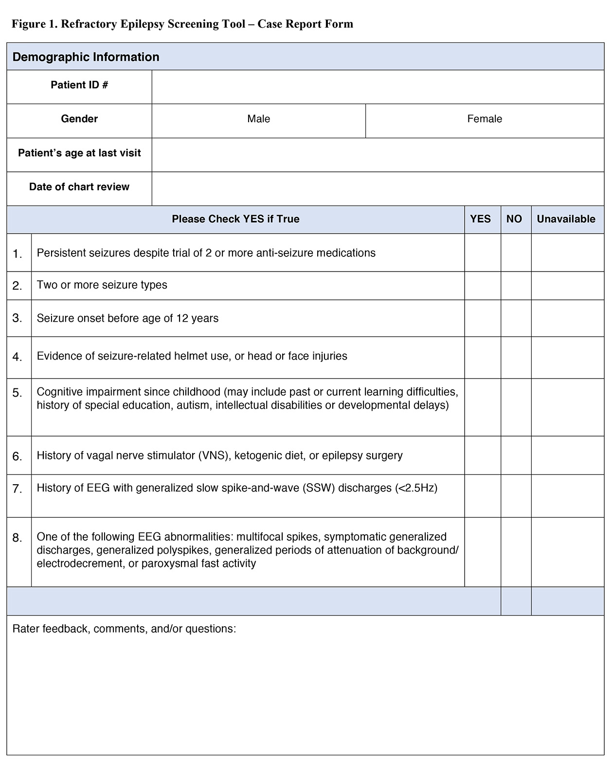 Rationale: Lennox-Gastaut Syndrome (LGS), a severe epileptic encephalopathy, is characterized by a classic triad of symptoms: intractable seizures (multiple types, including drop seizures), cognitive impairment, and abnormal electroencephalogram (EEG) with generalized 1.5–2.5 Hz slow spike-wave discharges. Though onset typically occurs by 8 years of age, LGS persists into adulthood; it may be misdiagnosed in older patients as the classic LGS triad is often not present later in life. The accurate diagnosis of LGS—especially in older patients—is complex, and misdiagnosis can result in suboptimal treatment. A group of experts who care for patients with refractory epilepsy and intellectual and developmental disabilities created the Refractory Epilepsy Screening Tool for LGS (REST-LGS) to improve both the identification and treatment of patients with LGS. Methods: Patient data captured on a case report form (CRF, Figure 1) administered in two large, diverse epilepsy centers will be used to identify potential diagnostic areas that require clarification and measure the extent of inter-rater reliability (IRR). De-identified records of patients >12 years of age with refractory epilepsy with ≥2 clinic notes within the previous 2 years will be included; the first note and two most recent notes will be reviewed. Two raters—a specialist (epileptologist/neurology nurse practitioner) and a non-specialist (nurse, social worker, resident, or pre-medical student)—will complete a CRF for each patient. Raters will be blinded to each other’s responses. A sample size of 100 patients per site was selected based on established methodology. Variables will be described in absolute and relative frequencies, mean and standard deviation, or median and interquartile range where appropriate. Comparisons will be made using t-test, Pearson's chi-square test, and/or Fisher’s exact test. The extent of IRR will be analyzed via Cohen’s kappa statistic. Results: Patients with refractory epilepsy are currently being identified at each facility by specialist raters. Both specialist and non-specialist raters are independently completing CRFs for each patient. CRFs will be analyzed to determine the validity of the REST-LGS, and the expert team will meet to discuss the outcomes of the analysis and to refine the tool. Conclusions: Proper treatment of LGS is important to improve patient outcomes; however, LGS is difficult to diagnose, especially in older patients. The REST-LGS was designed to improve the identification and treatment of patients with LGS. The tool is currently being evaluated by expert and novice raters. Funding: Funding: Lundbeck LLC