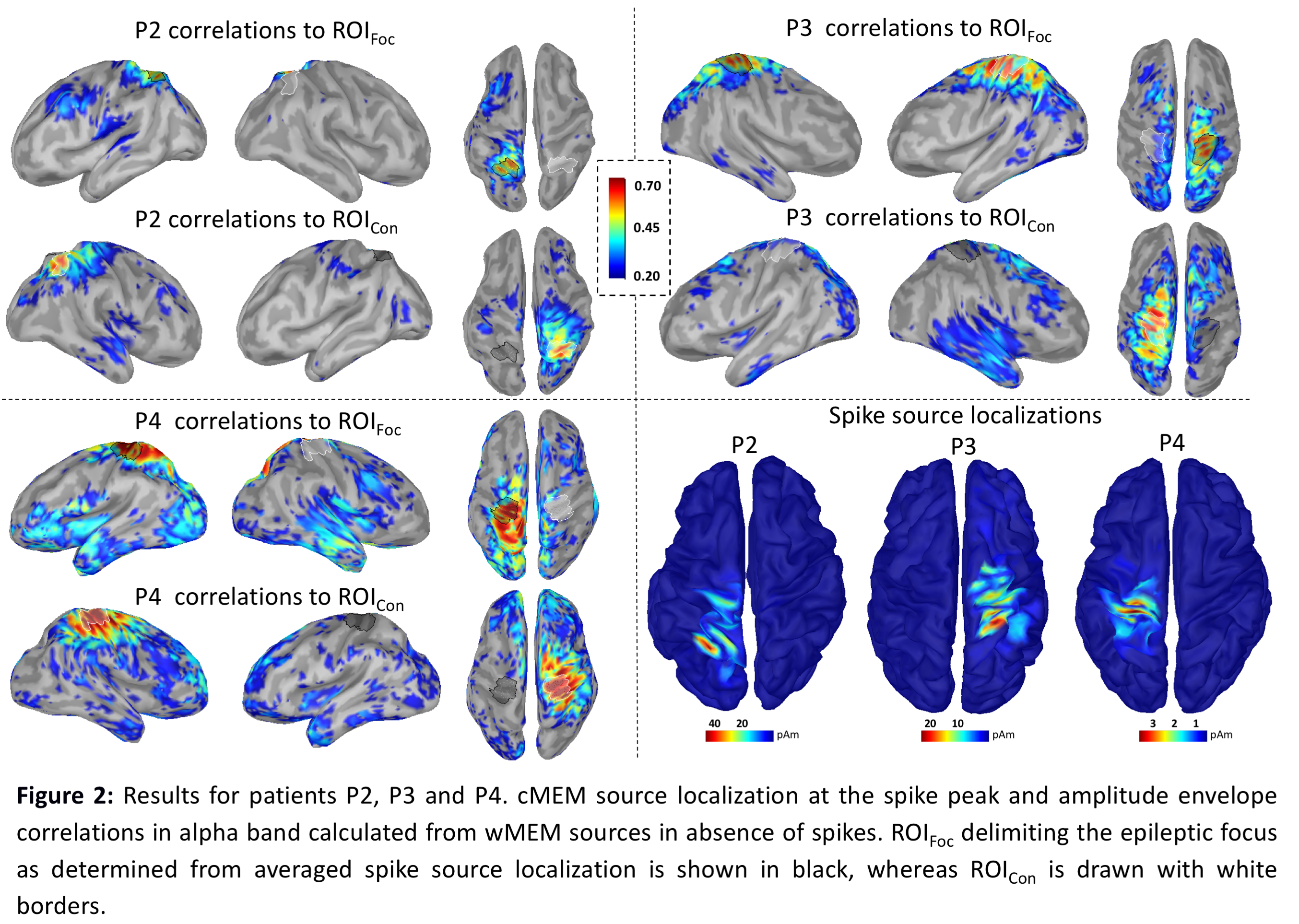 Rationale: Presurgical investigation of patients with pharmacoresistant focal epilepsy mainly consists in localizing the focus where epileptic discharges (EDs) are generated. However, functional connectivity (FC) studies of slow hemodynamic fluctuations using resting state fMRI suggested rather distributed network reorganizations (Pittau, Epilepsia 2012, 53:1013–23, Dansereau, Front Neurosci 2014, 8:419). Resting state FC might enhance our understanding of the disease pattern, regardless of EDs, and might also be used as a promising tool to tailor surgery or to predict surgical outcome (Englot, BRAIN 2015, 138:2249–62). Here, we considered Magnetoencephalography (MEG) to investigate differences in FC patterns within the alpha band for the presumed focus and the contralateral homologous region. Methods: All interictal EDs from MEG recordings of 4 pharmacoresistant focal epilepsy patients were marked by an epileptologist (GP) and source localization was done using coherent Maximum Entropy on the Mean (cMEM) (Chowdhury, NIMG 2016, 143:175-95) at the peak of the averaged EDs. Presumed focus region of interest (ROIFoc), based on cMEM results, and a contralateral homologous region (ROICon) of the same size were drawn along the cortical surface. We selected 20 epochs, of 2s each, without any EDs or artifacts and concatenated them before filtering in alpha band (8-13 Hz). Wavelet based MEM (wMEM), offering a framework to perform source localization of oscillatory activity in the time-frequency domain, was used to reconstruct fluctuations of alpha band activity along the cortical surface (Lina, IEEE TBME 2014, 61(8):2350-64). Band limited amplitude envelope correlations is a MEG metric providing similar results to fMRI resting state FC (Brookes, PNAS 2011, 108(40):16783-8). Envelope correlations were estimated between each vertex of the selected ROI and all other vertices of the cortical surface (~8000), averaged and thresholded at 0.2, resulting in a single seed-based FC map for each ROI. Results: We observed distinct FC patterns for ROIFoc in comparison to ROICon. For 3 out of 4 patients, FC map with the presumed focus exhibited correlated slow fluctuations of the amplitude of alpha band activity mainly limited to the same hemisphere and nearby regions, suggesting more local networks. On the other hand, FC maps with the ROICon showed both short and long distance connections, exhibiting correlations with the contralateral hemisphere notably (Figs 1 and 2).In patient 1 (P1), we found higher FC between ROICon and the contralateral temporal pole and visual cortex in comparison to the FC map involving the focus (Fig1). For P2 contralateral inferio-parietal/angular and for P3 contralateral temporal lobe connections were higher when considering FC maps involving ROICon (Fig2). FC maps for P4 did not exhibit the same pattern, since ROIFoc map was showing bilateral involvement. Conclusions: These preliminary findings suggest decreased long distance connections (measured as alpha band amplitude modulation) with the presumed epileptic focus, when compared to FC maps involving the contralateral ROI. Similar reorganizations of resting state FC patterns were also observed using fMRI (Negishi, Epilepsia 2011, 52(9):1733-40). Whether this decrease in FC is a protection mechanism to isolate the epileptic focus or a result of recurring seizures is currently unknown. However, MEG FC analysis might provide valuable additional information to further characterize these reorganizations of ongoing resting state neuronal activity, occurring even in the absence of epileptic discharges. Funding: Savoy foundation and FRQS postdoctoral fellowships, CIHR MOP 133619 and 93614, NSERC Discovery grant and FRQNT Research team grant.