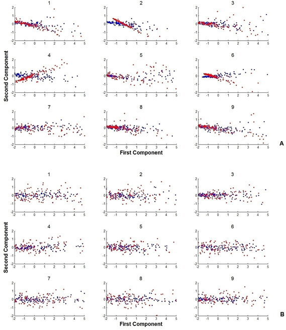 Rationale: Neural state representation is an important step in developing neurophysiological biomarkers and designing closed-loop neuromodulation therapies for epilepsy. Compact spatio-temporal descriptors with low computational complexities are especially desirable in fully implantable closed-loop systems with limited computational resources. We defined a state-space that was spanned by principal components of the power of Local Field Potentials (LFPs) and, using a subspace projection, studied the dynamics of CA1 and CA3 in a rat model of epilepsy.Methods: LFP signals in CA1 and CA3 were recorded simultaneously using microelectrode arrays in epileptic (tetanus toxin model) and control rats. Sprague-Dawley rats were implanted in the dorsal hippocampus using a custom designed 16-electrode array with 8 microwire electrodes in CA1 and 8 in CA3. Power of the signal in non-overlapping 500 ms time bins were computed for each electrode as the feature vector. The CA1 and CA3 feature vectors were buffered in a 1 min time window. The standard deviation of each channel was normalized individually and the resulting data matrix was projected to a 2D subspace that was spanned by the first and second Principal components.Results: Using our spatio-temporal subspace projection algorithm a 4000:1 compression ratio was achieved. Fig 1 compares 9 minutes of continuous LFP recordings in epileptic and control rats. Each subplot corresponds to 1 minute and each dot represents 500 ms block of data. Comparing the CA1 and CA3 state-trajectories in the projection space reveals different patterns between the epileptic and control rats. Unlike in the control rats, the pattern of neural state trajectories in epileptic rats exhibited pseudo-periodic contractions and expansions episodes, especially in CA3. During a seizure (blocks 5 and 6 in Fig 1A) the CA3 contraction pattern propagated to CA1. After the seizure, both CA1 and CA3 showed a pattern that was similar to that in the control rat.Conclusions: We present a simple and effective approach to reduce the dimensionality of continuous multi-channel recordings. Our results demonstrated that using this approach a subspace projection can be defined for compact spatio-temporal representation of hippocampal neural dynamics in epilepsy. In the state-space spanned by CA1 and CA3, epileptic neural activities exhibited dynamic heterogeneous patterns that correlated with behavioral seizures. In contrast, normal neural activities in hippocampus represented a pattern that was more homogeneous. The goal of closed-loop neuromodulation systems for treatment of epilepsy is to constrain the neural state trajectories. The CA1-CA3 subspace projection method may be useful for visualization of neural state trajectories and provide metrics for measuring the distance between the epileptic and normal neural states.