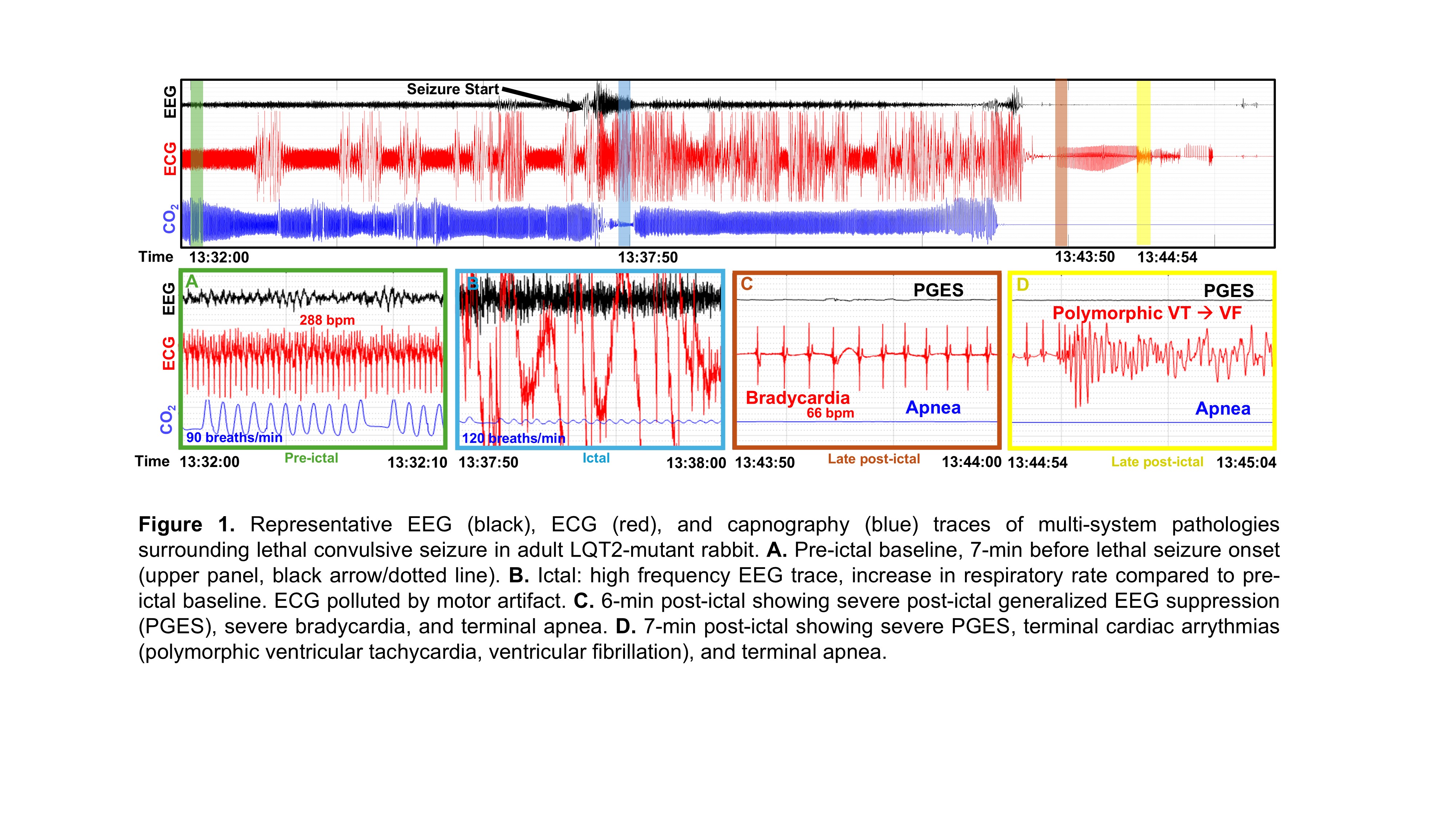 SUDEP is the leading cause of death in people with epilepsy, yet the mechanisms of SUDEP are not well understood. It is likely a multi-system cascade of cardiac arrythmias, post-ictal generalized EEG suppression (PGES), respiratory failure, and autonomic disturbances. The MORTEMUS study showed that following a generalized tonic-clonic seizure (GTCS), there is a multisystem cascade of cardio-respiratory dysfunction that culminated in SUDEP. Long QT Syndrome Type-2 (LQT2) is a potassium channelopathy caused by loss-of-function KCNH2 gene variants, which is expressed in the heart and brain. KCNH2 variants were detected in DNA analysis from SUDEP cases. We developed a knock-in Kcnh2 mutant rabbit model of LQT2, which reproduces the neuro-cardiac pathologies seen in people with LQT2. These include cardiac QTc prolongation, arrhythmias, seizures, and sudden death (sudden cardiac death & SUDEP). Using our novel model of LQT2, we evaluated the temporal concordance of peri-ictal cerebral-cardiac-respiratory-autonomic changes surrounding non-lethal and lethal drug-induced convulsive seizures.Methods: