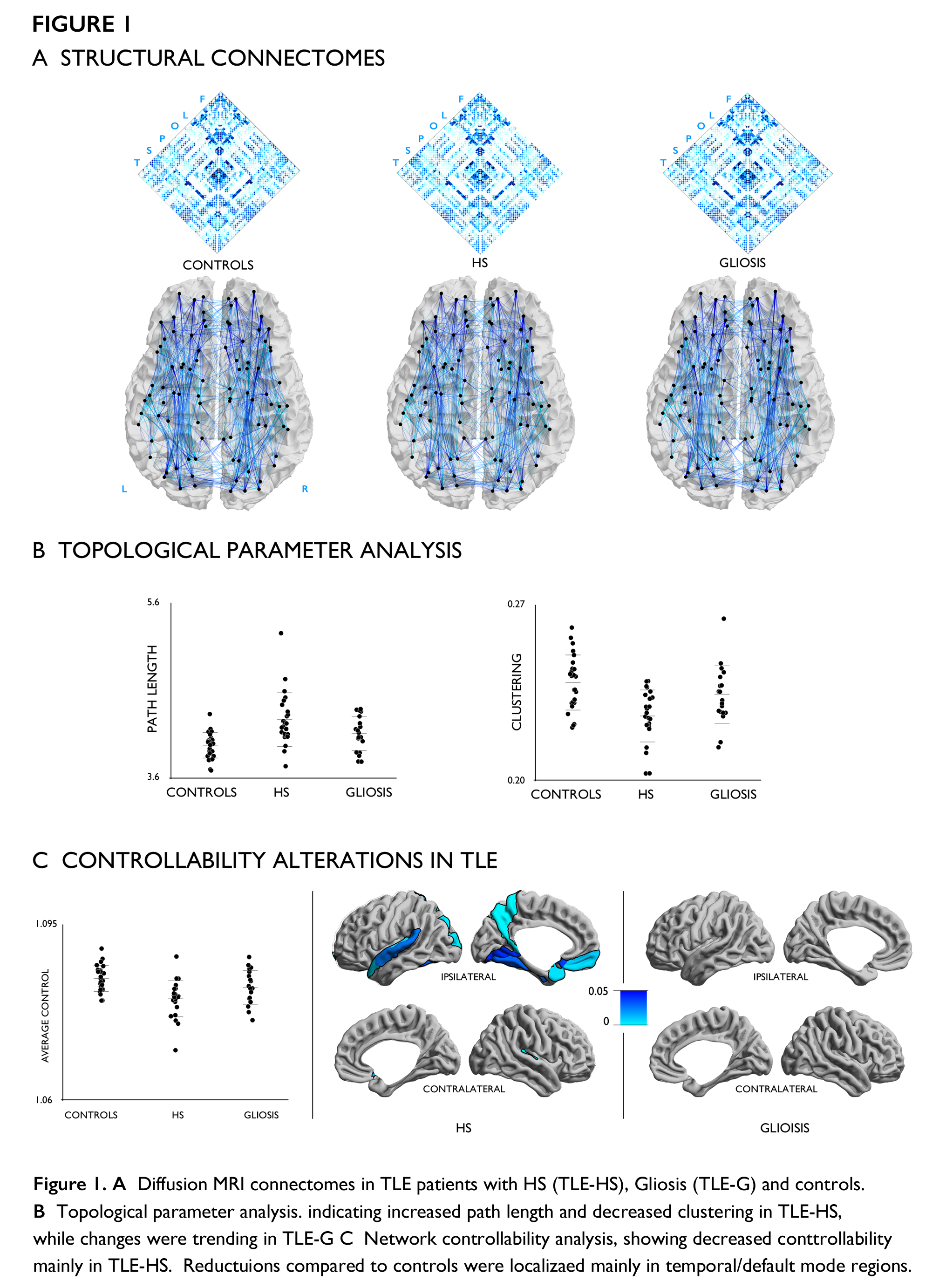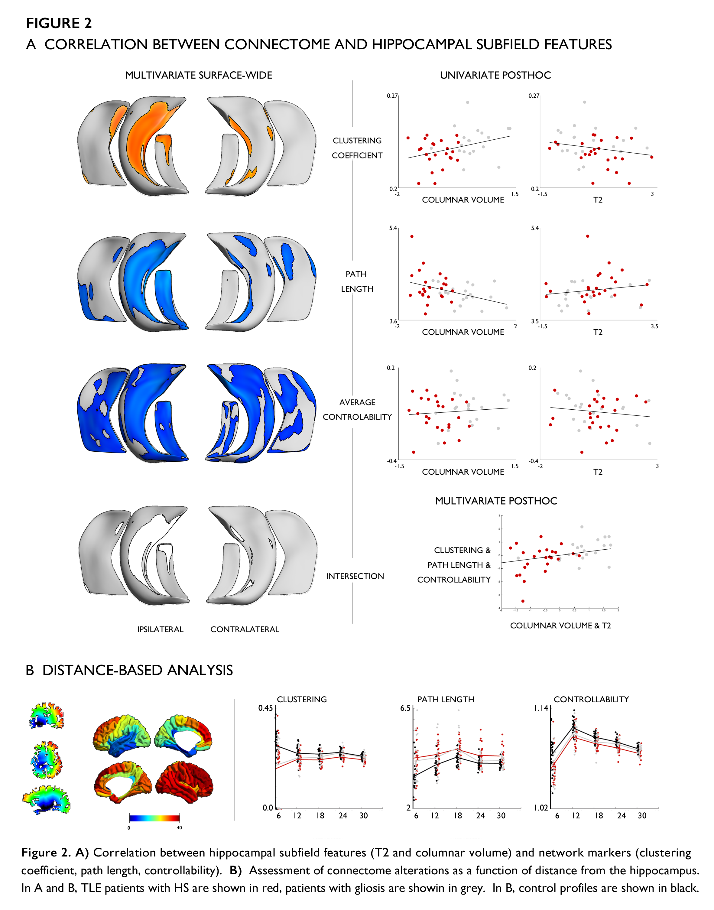 Rationale: The hallmark of temporal lobe epilepsy (TLE) is hippocampal sclerosis (HS), a lesion characterized by cell loss and gliosis [1].  Increasing evidence from morphometry and connectivity studies suggests that anomalies often extend beyond to impact large-scale networks [2]. To assess whether the severity of HS pathology is mirrored in whole-brain network anomalies, we combined diffusion connectomics with high-resolution hippocampal subfield analysis in a cohort of TLE patients with variable degrees of histologically-verified HS.  Methods: We studied 44 drug-resistant TLE patients and 25 age- and sex-matched healthy individuals. All patients had been operated at the time of study, and histological exam revealed marked hippocampal cell loss and gliosis in 24 (TLE-HS) and isolated gliosis in 20 (TLE-G). Patient subgroups had similar age, sex, age at seizure onset, and duration of epilepsy. Hippocampal subfield segmentations were based on high-resolution T1-weighted and co-registered T2-weighted data at 3T. For hippocampal in-vivo phenotyping, we applied surface-based techniques that measure atrophy (a proxy for cell loss) and T2 hyperintensity (indexing gliosis) along individual subfields [3]. Connectomes were derived from whole-brain diffusion MRI tractography.  We assessed group differences in network topology using graph theory (Fig. 1A). Moreover, we used a recent network control theoretical framework to calculate average controllability, which captures whether a given area could drive the network’s entire dynamics [4]. Multivariate analysis evaluated the modulation of network markers (clustering, path length, controllability) by in-vivo markers of hippocampal subfield pathology. Finally, we employed a geodesic distance mapping paradigm to assess associations between network alterations and spatial proximity to the hippocampus.  Results: We observed gradual alterations of network topology in patients compared to controls (Fig. 1B), with marked increased path length and decreased clustering (indicative of reduced global/local efficiency) in TLE-HS (p < 0.001) and subtle changes in TLE-G (p < 0.1). Group comparison of overall controllability showed also a gradient (Fig. 1C), with more severe decreases in TLE-HS (p < 0.001) than TLE-G (p < 0.05). Regional analysis indicated controllability reductions in posterior default mode regions known to be densely connected to the mesiotemporal lobe in TLE-HS, while changes did not survive correction for multiple comparisons in TLE-G. Across the TLE cohort, multivariate analysis revealed a consistent relation between network anomalies and subfield markers of abnormal volume/T2 intensity, particularly in ipsilateral CA1-3 (FDR < 0.1; Fig. 2A). Distance-based mapping demonstrated that network-level disruptions are most marked in the proximity of the hippocampus, tapering off with increasing distance (Fig. 2B).  Conclusions: Combined high-resolution analysis of hippocampal subfields and whole-brain connectomics provides evidence for a positive association between the severity of microscopic tissue anomalies and structural network configurations in TLE. Hippocampal pathology may exert a cascading impact on large-scale networks, the severity of which depends on the degree of pathology, likely via retrograde degeneration.  References:[1] Bluemcke et al. 2013, Epilepsia, 54(7): 1315-29 [2] Bernhardt et al. 2015, Epilepsy Behav, 50: 162–170[3] Bernhardt et al. 2016, Ann Neurol, 80(1): 142-53.[4] Gu et al. 2015 Nat Commun, 6: 8414. Funding: Canadian Institutes of Health Research (CIHR) and Fonds de la reserche du quebec - santé (FRQS)