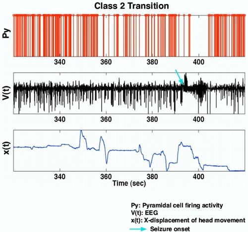 Rationale: Spontaneous seizures in temporal lobe epilepsy (TLE) occur in part by abnormal neuronal activity within the hippocampus. However, the relationship between the firing properties of hippocampal CA1 pyramidal cells during seizure onset is largely unknown. Here we study the relationship between in vivo firing patterns of CA1 pyramidal cells and interneurons and pre-seizure interictal spikes in a spontaneous seizure animal model of TLE. Methods: Seventy-day-old adult male Sprague-Dawley rats (n=5) were treated with lithium pilocarpine in order to induce status epilepticus. After 2 months, rats developed Racine grade 5 spontaneous epileptic seizures. Single unit recordings were obtained (sampling rate 32 kHz) using 24 channels of 6 microwire tetrode arrays placed in the CA1 region. Eight of these 24 channels were also used to obtain simultaneous CA1 region EEG recordings (sampling rate 2 kHz). A light-emitting diode tracked both head position and locomotion during EEG and tetrode microelectrode recordings. Results: : Rats developed two classes of pre-seizure patterns labeled class 1 and class 2. A total of five class 1 and 14 class 2 pre-seizure patterns were observed. Class 1 pattern showed intermittent polyspike and spike/wave activity concomitant with decreased CA1 pyramidal cells firing rate. Head movement was stationary during class 1 transition to seizures. In contrast, class 2 pre-seizure patterns were accompanied by active movement and high frequency EEG spiking activity. In addition, a transient change in pyramidal cells firing rate was observed, concomitant with head movement. Conclusions: These preliminary findings suggest that during seizure onset 1) characteristic changes in both EEG and single unit CA1 pyramidal cells firing properties may in part be influenced by rat activity, and 2) CA1 pyramidal cells firing properties may contribute in part to the two distinct EEG seizure patterns.