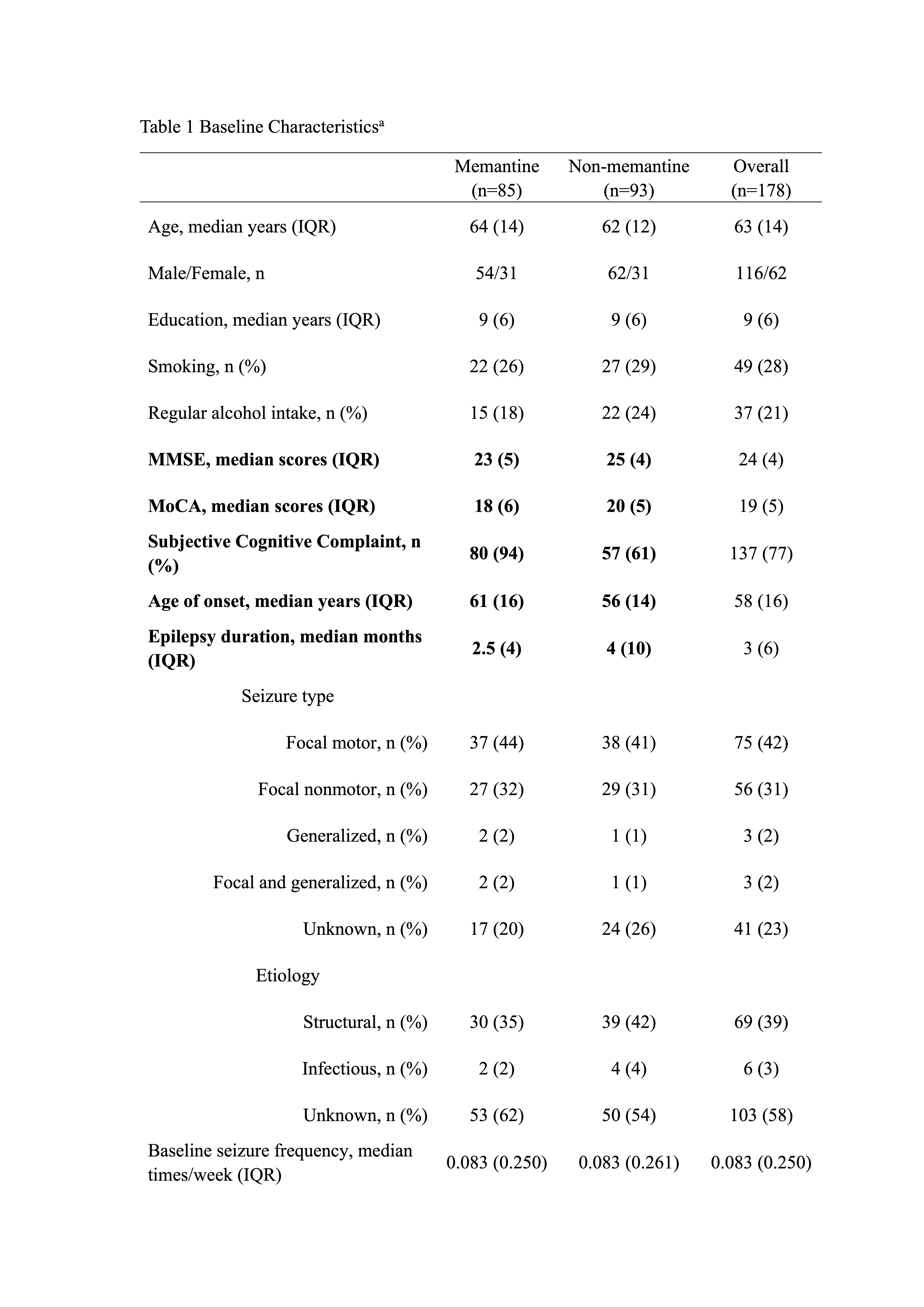 Results: A total of 178 participants were enrolled (median age, 63; male, 65%). Among them, eighty-five (48%) started memantine. Epilepsy etiology, ASM regimens, and baseline seizure frequency were comparable between groups. Median follow-up duration was 51 (24-81) weeks. During follow-up, no event of new-onset generalized tonic-clonic seizure was recorded; one event of new-onset status epilepticus was recorded in the non-memantine group. Increased seizure frequency was reported by nine (5%) participants (memantine vs. non-memantine, 5 vs. 4). Seizure frequency remained stable during the follow-up period in the memantine group compared to baseline. The most frequently reported TEAEs in the memantine group included headache (7%), dizziness (5%), fatigue (4%), and drowsiness (2%). The 24-week retention rate was 91%. Reasons for discontinuation included intolerable TEAEs (n=4) and unsatisfactory treatment response (n=4).