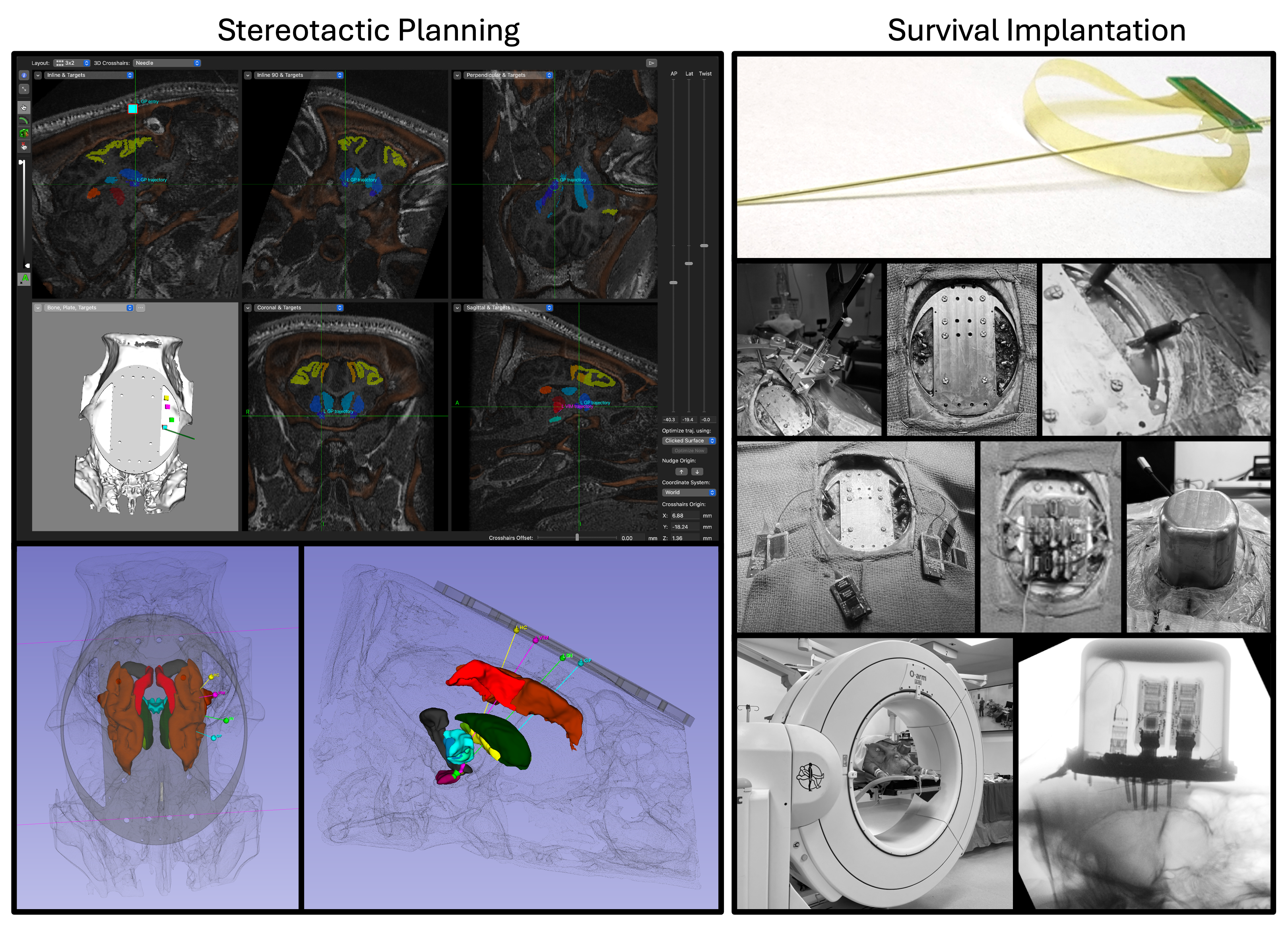 Pigs were selected given their relative homology to humans, large cerebral volume for a non-primate, and biologic tolerance of implanted hardware for semichronic experiments. The pig underwent a first stage anesthetic event for CT and MRI imaging to facilitate surgical planning before a second stage implantation of stereotactic leads with neuronavigation. Each of the implanted leads was 15 μm thick and 1.2mm wide with 128 microcontacts for recording and 16 macrocontacts for stimulation distributed over 3cm. Head-mounted amplifiers and serializer protected by a titanium cap enabled a single line connection for data and power to a secondary backworn unit. This secondary unit was positioned between the shoulders, anchored to a jacket worn by the pig. The backworn unit enabled wireless recordings at 30kHz and current injection of up to 96 channels by chronometric or closed-loop triggers.