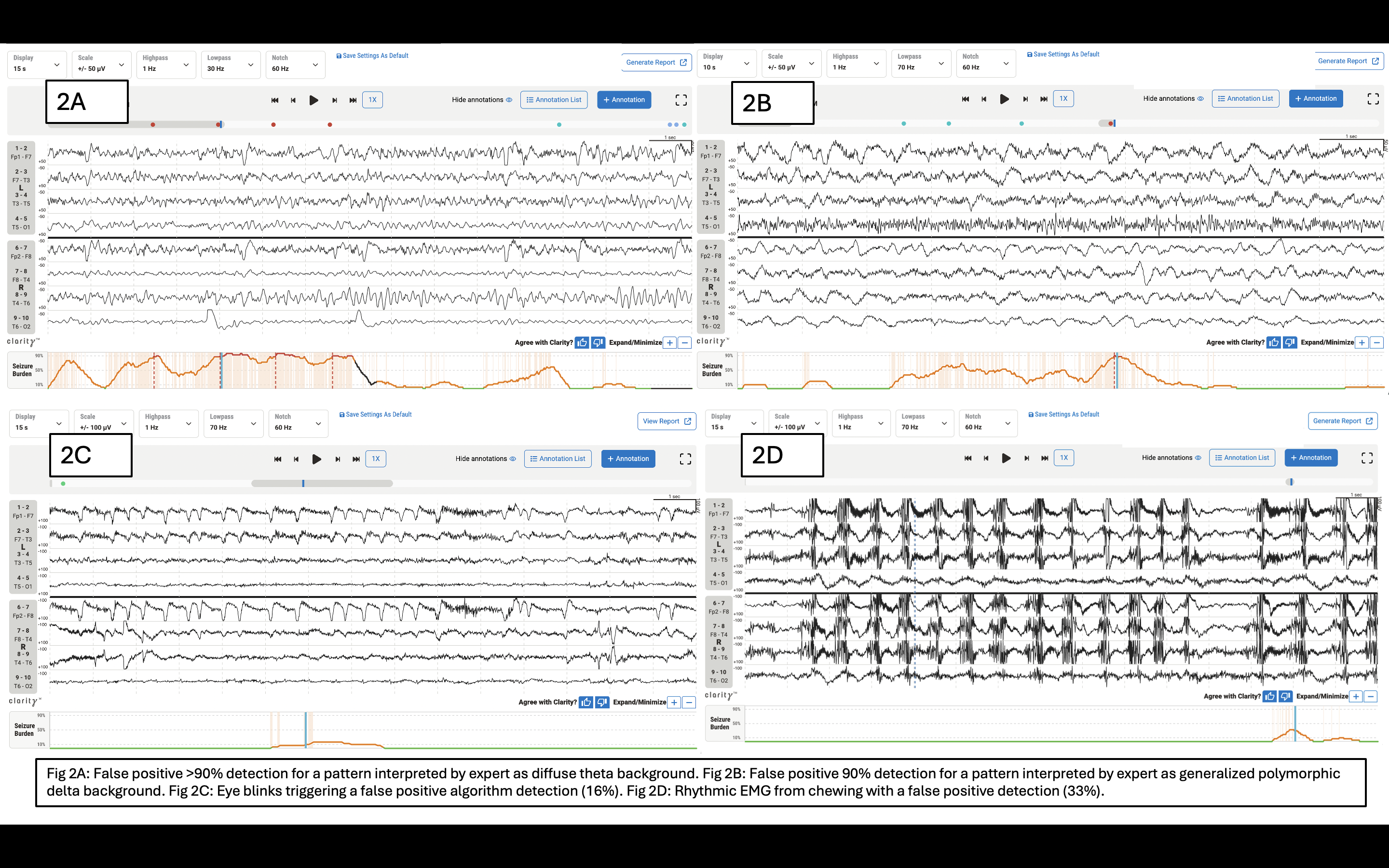 Eighty-three RR-EEGs were reviewed. At least 39 patients (47%) were awake at baseline mental status at the time of EEG. Six patients had seizures, 3 electrographic (Esz or ESE) and 3 electroclinical (ECSz or ECSE) and 3 of these were classified as status epilepticus (5 min or >90% worst 5 min burden). The measures of sensitivity and negative predictive value were limited by the low number of patients with seizures in this cohort and observations of discordant patient and event level data (Fig 1 ) Specificity was low at lower seizure burden thresholds and progressively improved with use of higher cutoffs with 97% specificity at >90% cutoff (Fig 1). False positive detections at >90% threshold were seen with higher amplitude theta or delta background (Fig 2A/2B). Additional false positive detections at thresholds between 20-90% were seen with artifact from rapid eye blinks, rhythmic EMG artifact from chewing and other electrode artifacts (Fig 2C/2D).