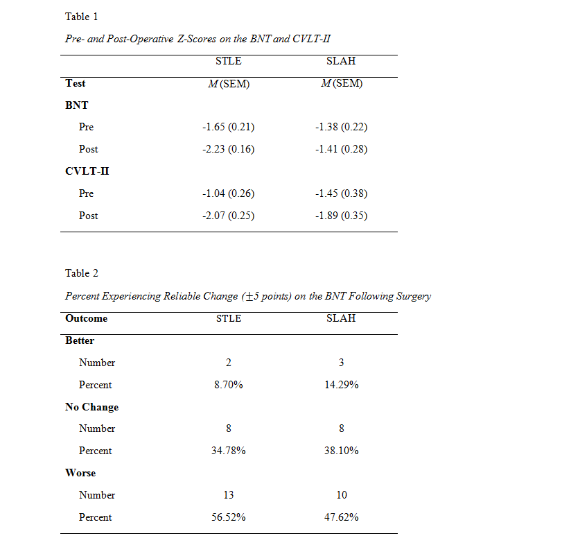 Rationale: Stereotactic laser amygdalohippocampectomy (SLAH) is an alternative to standard temporal lobectomy (STLE) in patients with temporal lobe epilepsy (TLE). SLAH may be preferable to STLE because it is less invasive and has the potential to minimize post-surgical cognitive deficits; however, limited data comparing the cognitive outcomes between these procedures is available. Methods: Pre- and post-operative neuropsychological data from 23 patients who underwent dominant hemisphere STLE (12 males; age M = 33 years) and 21 patients who underwent dominant hemisphere SLAH (12 males; age M = 41 years) between 2008 and 2017 were retrospectively analyzed. The groups did not differ in terms of age, gender, or intelligence (SLAH M = 94.77, SD = 19.03; STLE M = 90.16, SD = 18.46). The left hemisphere was presumed language dominant in right-handed patients where Wada results were not available. Wada results confirmed language laterality in all left-handed patients. Pre-surgical MRIs indicated 31.82% (n = 14) of patients had normal MRIs, 40.91% (n = 18) had findings isolated to the left temporal lobe, and 25% (n = 11) had findings outside the left temporal lobe. Mean evaluation time post-surgery was 5.9 months and 8.2 months for SLAH and STLE patients, respectively. Outcome measures were Z-scores on the Boston Naming Test, Second Edition (BNT) and the Long Delay Free Recall portion of the California Verbal Learning Test, Second Edition (CVLT-II). A change in raw score across the surgery of plus or minus 5 points on the BNT was used as a reliable change index (RCI), one measure of statistically meaningful change (Epilepsy Behav. 2012; 24(2): 194-8.). Results: Data were analyzed using a general linear model approach with post-operative performance as the dependent variable, surgery type (STLE, SLAH) as the independent variable, and pre-operative performance as a covariate entered first in the equation (Work. 2003; 20(2): 159-65.). There were no significant findings for the CVLT-II, p < .30; however, findings for the BNT were significant, F(1,41) = 5.93, p < .02. As shown in Table 1, the STLE group experienced a greater decline in naming, but not memory, after surgery than the SLAH group. Analyses of group effect on RCI data using Fisher’s exact test were marginally significant (p < .07). As shown in Table 2, more patients in the SLAH group exhibited improvement, and fewer a decline. Conclusions: Findings suggest patients undergoing dominant hemisphere SLAH experienced less decline in naming, but a similar decline in memory, after surgery as compared to STLE patients. They also experienced a greater rate of improvement and a reduced rate of decline compared to the STLE group in visual naming. These preliminary results suggest SLAH’s minimally-invasive nature may minimize some post-surgical verbal deficits compared to STLE, but does not appear to preserve verbal memory more effectively than STLE. Funding: No funding was received in support of this abstract.