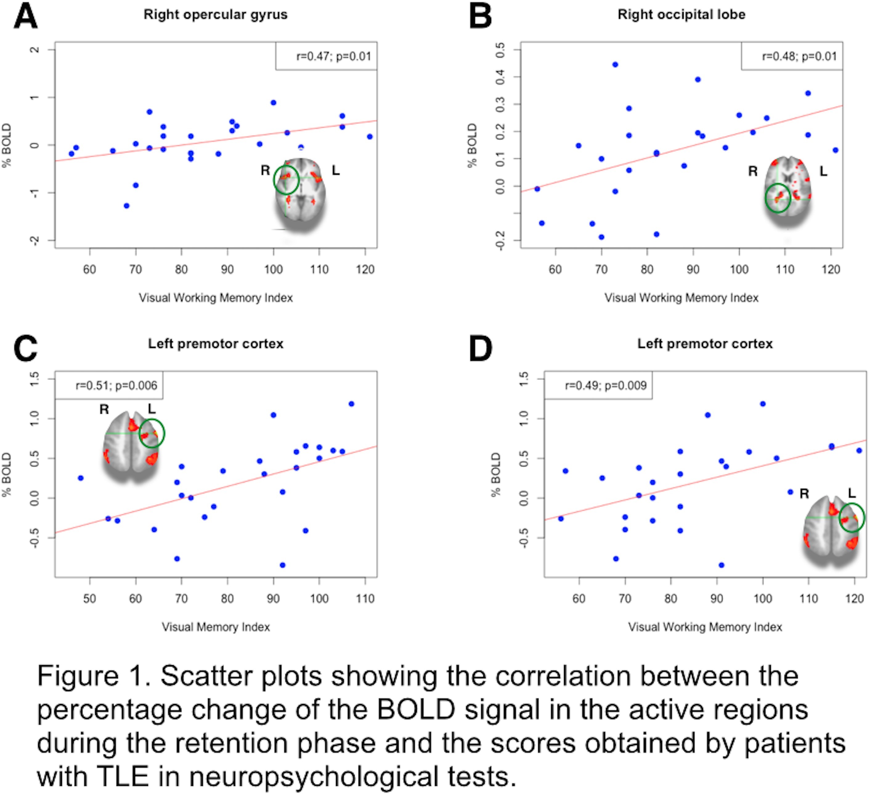 Rationale: Temporal lobe epilepsy (TLE) is the most common type of partial epilepsy and is the leading cause of refractory epilepsy [Téllez-Zenteno J. F. et al. Epilepsy Res. Treat. 2012]. Cognitive deficits in several domains have been described in TLE patients, including working memory (WM) [Hermann et al., J Int Neuropsychol Soc 2007]. Several white matter regions that interconnect the temporal lobe to the rest of the brain are known to be affected in TLE [Otte, W. M. et al. Epilepsia 2012], which explains why several cognitive functions (such as WM) are affected, despite not having their neural substrate in the affected temporal lobe. Functional MRI (fMRI) studies have shown that the normal bilateral frontoparietal network in WM is impaired in TLE patients [Winston, G. P. et al. Epilepsia 2013]. Here, we investigate cortical activity in response to a WM task, and how this activity correlates with a thorough neuropsychological evaluation in TLE patients.Methods: We recruited 35 patients with diagnosis of TLE and 23 healthy controls. Patients were assessed with WAIS-IV and WMS-IV neuropsychological tests. Structural and functional images were obtained using a 3.0 T Philips MRI scanner. During fMRI scanning participants completed Sternberg’s task, which evaluates WM and divides it into phases of codification, retention and recall. First, we identified the brain regions (cluster p<0.05, corrected) that were active during the retention phase in the controls. Next, we queried the signal change within those regions for each patient. Finally, we correlated these signal changes with neuropsychological evaluations. For statistical analysis, we used Student's t-test for reaction times, Mann-Whitney test for number of correct answers and Pearson's correlation for correlations between BOLD signal and psychometric tests scores.Results: There was a significant difference on reaction times of the task (p=0.001) between controls (mean 1670±324 ms) and patients (mean 2002±407 ms) as well on number of correct answers (p=0.03) between controls (mean 10.9±2.3) and patients (mean 9.3±3.4). Both groups showed cortical activity during retention phase that involved the bilateral frontoparietal network as previously described [Stretton, J. et al. NeuroImage 2012]. There were no significant differences between groups in fMRI brain activity during the task. Correlations are listed in Figure 1: visual working memory index showed a positive correlation with activity of the right opercular gyrus (r=0.47; p=0.01) (A), as well with the right visual cortex (r=0.48; p=0.01) (B). Left premotor cortex, showed a positive correlation with the visual memory index (r=0.51; p=0.006) (C) and with the visual working memory index (r=0.49; p=0.009) (D).Conclusions: Our results show that while patients have relatively small deficits in WM, the activity of the cortical networks that support such a function are predictive of their performance.